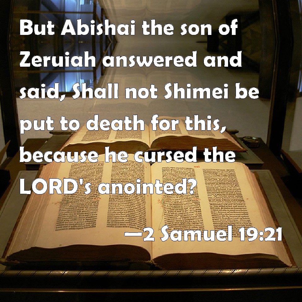 Choose a Background 2 Samuel 19:21 But Abishai the son of Zeruiah answered and said, Shall not Shimei be put to death for this, because he cursed the LORD's anointed? KJV: But Abishai the son of Zeruiah answered and said, Shall not Shimei be put to death for this, because he cursed the LORD'S anointed? DRB: But Abisai the son of Sarvia answering, said: Shall Semei for these words not be put to death, because he cursed the Lord's anointed? DBT: And Abishai the son of Zeruiah answered and said, Should not Shimei be put to death for this, because he cursed Jehovah's anointed? ERV: But Abishai the son of Zeruiah answered and said, Shall not Shimei be put to death for this, because he cursed the LORD'S anointed? WBT: But Abishai the son of Zeruiah answered and said, Shall not Shimei be put to death for this, because he cursed the LORD'S anointed? WEB: But Abishai the son of Zeruiah answered, "Shall Shimei not be put to death for this, because he cursed Yahweh's anointed?" YLT: And Abishai son of Zeruiah answereth and saith, 'For this is not Shimei put to death — because he reviled the anointed of Jehovah?'Links 2 Samuel 19:21 NIV • 2 Samuel 19:21 NLT • 2 Samuel 19:21 ESV • 2 Samuel 19:21 NASB • 2 Samuel 19:21 KJV • 2 Samuel 19:21 Interlinear • 2 Samuel 19:21 Commentaries • 2 Samuel 19:21 Parallel Texts • 2 Samuel 19:21 Bible Apps • 2 Samuel 19:21 Parallel • Bible Hub |