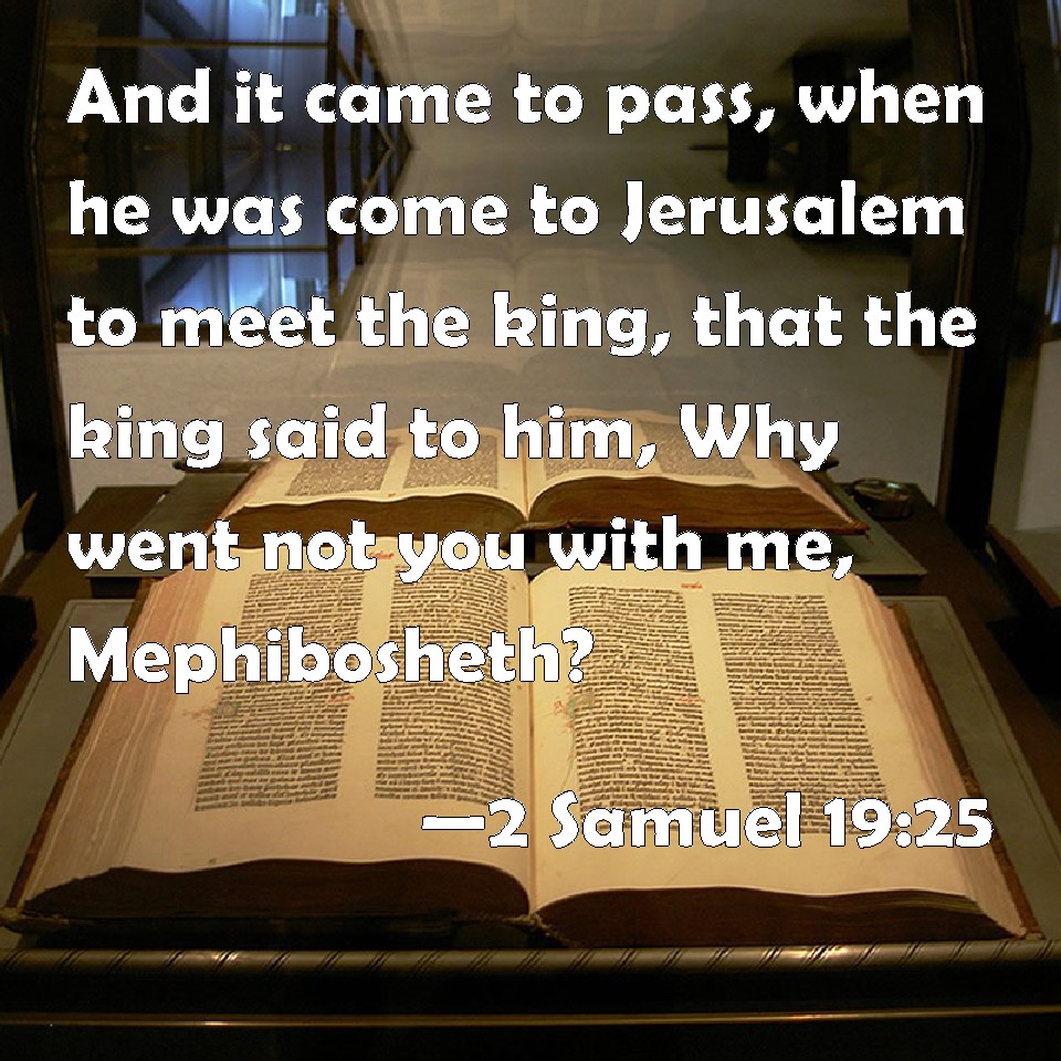 Choose a Background 2 Samuel 19:25 And it came to pass, when he was come to Jerusalem to meet the king, that the king said to him, Why went not you with me, Mephibosheth? KJV: And it came to pass, when he was come to Jerusalem to meet the king, that the king said unto him, Wherefore wentest not thou with me, Mephibosheth? DRB: And when he met the king at Jerusalem, the king said to him: Why camest thou not with me, Miphiboseth? DBT: And as soon as Jerusalem came to meet the king, the king said to him, Why didst thou not go with me, Mephibosheth? ERV: And it came to pass, when he was come to Jerusalem to meet the king, that the king said unto him, Wherefore wentest not thou with me, Mephibosheth? WBT: And it came to pass, when he had come to Jerusalem to meet the king, that the king said to him, Why didst thou not go with me, Mephibosheth? WEB: It happened, when he had come to Jerusalem to meet the king, that the king said to him, "Why didn't you go with me, Mephibosheth?" YLT: and it cometh to pass, when he hath come to Jerusalem to meet the king, that the king saith to him, 'Why didst thou not go with me, Mephibosheth?'Links 2 Samuel 19:25 NIV • 2 Samuel 19:25 NLT • 2 Samuel 19:25 ESV • 2 Samuel 19:25 NASB • 2 Samuel 19:25 KJV • 2 Samuel 19:25 Interlinear • 2 Samuel 19:25 Commentaries • 2 Samuel 19:25 Parallel Texts • 2 Samuel 19:25 Bible Apps • 2 Samuel 19:25 Parallel • Bible Hub |
