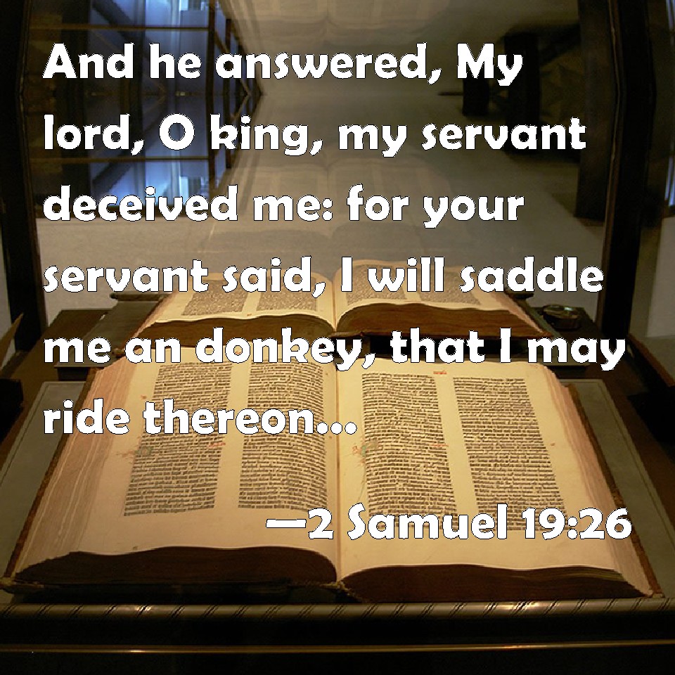Choose a Background 2 Samuel 19:26 And he answered, My lord, O king, my servant deceived me: for your servant said, I will saddle me an ass, that I may ride thereon, and go to the king; because your servant is lame. KJV: And he answered, My lord, O king, my servant deceived me: for thy servant said, I will saddle me an ass, that I may ride thereon, and go to the king; because thy servant is lame. DRB: And he answering, said: My lord, O king, my servant despised me: for I thy servant spoke to him to saddle me an ass, that I might get on and go with the king: for I thy servant am lame. DBT: And he said, My lord, O king, my servant deceived me; for thy servant said, I will saddle me the ass, and ride thereon, and go with the king; for thy servant is lame. ERV: And he answered, My lord, O king, my servant deceived me: for thy servant said, I will saddle me an ass, that I may ride thereon, and go with the king; because thy servant is lame. WBT: And he answered, My lord, O king, my servant deceived me: for thy servant said, I will saddle me an ass, that I may ride on it, and go to the king; because thy servant is lame. WEB: He answered, "My lord, O king, my servant deceived me. For your servant said, I will saddle me a donkey, that I may ride thereon, and go with the king; because your servant is lame. YLT: And he saith, 'My lord, O king, my servant deceived me, for thy servant said, I saddle for me the ass, and ride on it, and go with the king, for thy servant is lame;Links 2 Samuel 19:26 NIV • 2 Samuel 19:26 NLT • 2 Samuel 19:26 ESV • 2 Samuel 19:26 NASB • 2 Samuel 19:26 KJV • 2 Samuel 19:26 Interlinear • 2 Samuel 19:26 Commentaries • 2 Samuel 19:26 Parallel Texts • 2 Samuel 19:26 Bible Apps • 2 Samuel 19:26 Parallel • Bible Hub |