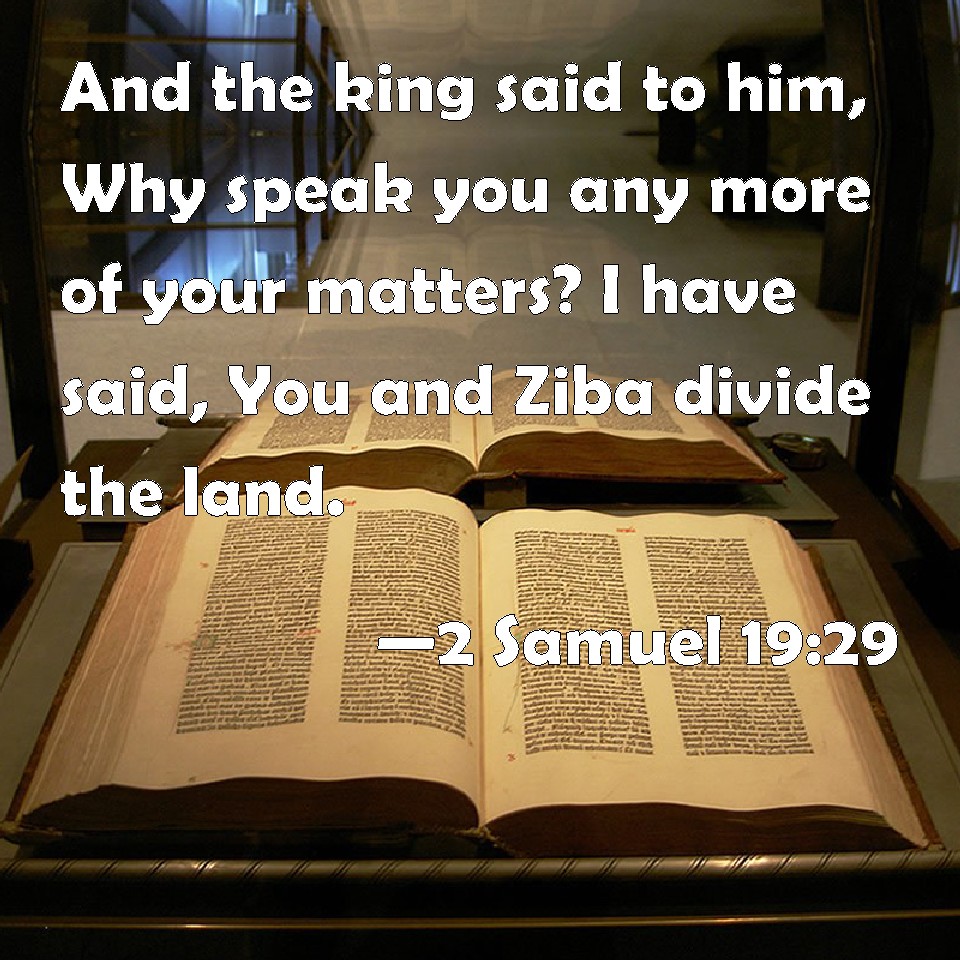 Choose a Background 2 Samuel 19:29 And the king said to him, Why speak you any more of your matters? I have said, You and Ziba divide the land. KJV: And the king said unto him, Why speakest thou any more of thy matters? I have said, Thou and Ziba divide the land. DRB: Then the king said to him: Why speakest thou any more? what I have said is determined: thou and Siba divide the possessions. DBT: And the king said to him, Why speakest thou any more of thy matters? I have said, Thou and Ziba divide the land. ERV: And the king said unto him, Why speakest thou any more of thy matters? I say, Thou and Ziba divide the land. WBT: And the king said to him, Why speakest thou any more of thy matters? I have said, Thou and Ziba divide the land. WEB: The king said to him, "Why do you speak any more of your matters? I say, you and Ziba divide the land." YLT: And the king saith to him, 'Why dost thou speak any more of thy matters? I have said, Thou and Ziba — share ye the field.'Links 2 Samuel 19:29 NIV • 2 Samuel 19:29 NLT • 2 Samuel 19:29 ESV • 2 Samuel 19:29 NASB • 2 Samuel 19:29 KJV • 2 Samuel 19:29 Interlinear • 2 Samuel 19:29 Commentaries • 2 Samuel 19:29 Parallel Texts • 2 Samuel 19:29 Bible Apps • 2 Samuel 19:29 Parallel • Bible Hub |