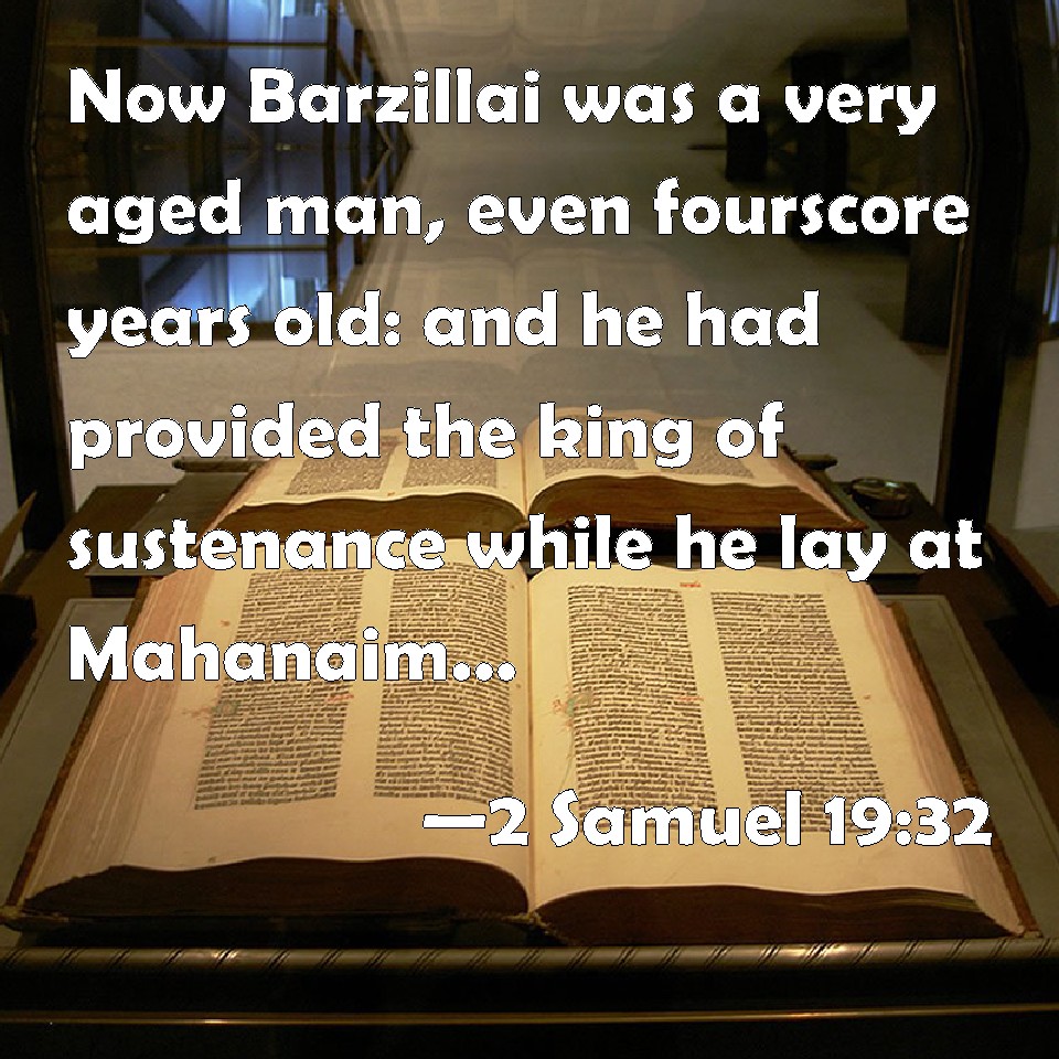 Choose a Background 2 Samuel 19:32 Now Barzillai was a very aged man, even fourscore years old: and he had provided the king of sustenance while he lay at Mahanaim; for he was a very great man. KJV: Now Barzillai was a very aged man, even fourscore years old: and he had provided the king of sustenance while he lay at Mahanaim; for he was a very great man. DRB: Now Berzellai the Galaadite was of a great age, that is to say, fourscore years old, and he provided the king with sustenance when he abode in the camp: for he was a man exceeding rich. DBT: And Barzillai was very aged, eighty years old; and it was he that had maintained the king while he abode at Mahanaim; for he was a very great man. ERV: Now Barzillai was a very aged man, even fourscore years old: and he had provided the king with sustenance while he lay at Mahanaim; for he was a very great man. WBT: Now Barzillai was a very aged man, even eighty years old: and he had provided the king with sustenance while he lay at Mahanaim: for he was a very great man. WEB: Now Barzillai was a very aged man, even eighty years old: and he had provided the king with sustenance while he lay at Mahanaim; for he was a very great man. YLT: and Barzillai is very aged, a son of eighty years, and he hath sustained the king in his abiding in Mahanaim, for he is a very great man;Links 2 Samuel 19:32 NIV • 2 Samuel 19:32 NLT • 2 Samuel 19:32 ESV • 2 Samuel 19:32 NASB • 2 Samuel 19:32 KJV • 2 Samuel 19:32 Interlinear • 2 Samuel 19:32 Commentaries • 2 Samuel 19:32 Parallel Texts • 2 Samuel 19:32 Bible Apps • 2 Samuel 19:32 Parallel • Bible Hub |
