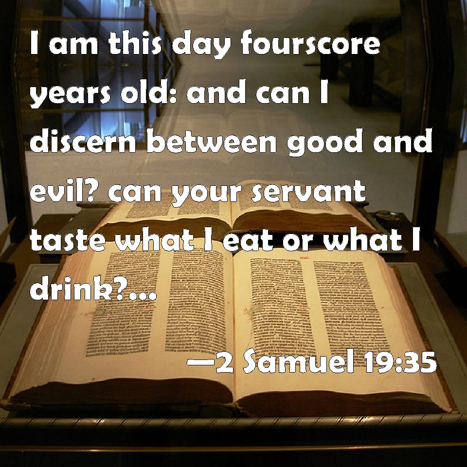 2 Samuel 19:35 I am this day fourscore years old: and can I discern between good and evil? can your servant taste what I eat or what I drink? can I hear any more the voice of singing men and singing women? why then should your servant be yet a burden to my lord the king?