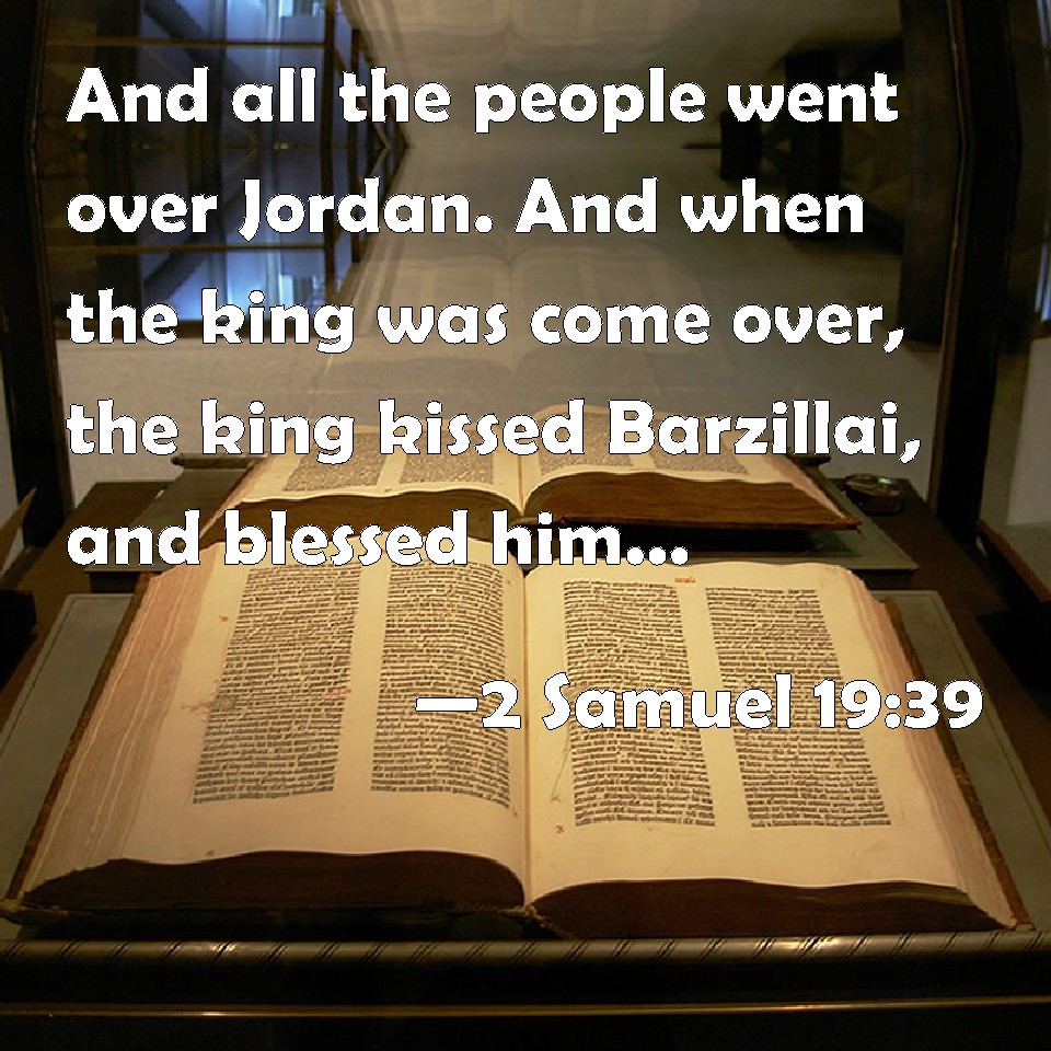Choose a Background 2 Samuel 19:39 And all the people went over Jordan. And when the king was come over, the king kissed Barzillai, and blessed him; and he returned to his own place. KJV: And all the people went over Jordan. And when the king was come over, the king kissed Barzillai, and blessed him; and he returned unto his own place. DRB: And when all the people and the king had passed over the Jordan, the king kissed Berzellai, and blessed him: and he returned to his own place. DBT: And all the people went over the Jordan; and the king went over; and the king kissed Barzillai, and blessed him; and he returned to his own place. ERV: And all the people went over Jordan, and the king went over: and the king kissed Barzillai, and blessed him; and he returned unto his own place. WBT: And all the people went over Jordan. And when the king had come over, the king kissed Barzillai, and blessed him; and he returned to his own place. WEB: All the people went over the Jordan, and the king went over. Then the king kissed Barzillai, and blessed him; and he returned to his own place. YLT: And all the people pass over the Jordan, and the king hath passed over, and the king giveth a kiss to Barzillai, and blesseth him, and he turneth back to his place.Links 2 Samuel 19:39 NIV • 2 Samuel 19:39 NLT • 2 Samuel 19:39 ESV • 2 Samuel 19:39 NASB • 2 Samuel 19:39 KJV • 2 Samuel 19:39 Interlinear • 2 Samuel 19:39 Commentaries • 2 Samuel 19:39 Parallel Texts • 2 Samuel 19:39 Bible Apps • 2 Samuel 19:39 Parallel • Bible Hub |