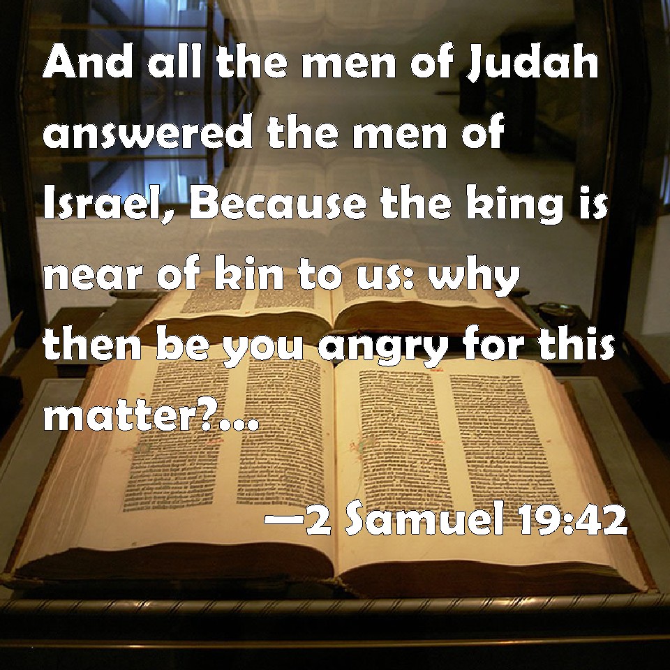 Choose a Background 2 Samuel 19:42 And all the men of Judah answered the men of Israel, Because the king is near of kin to us: why then be you angry for this matter? have we eaten at all of the king's cost? or has he given us any gift? KJV: And all the men of Judah answered the men of Israel, Because the king is near of kin to us: wherefore then be ye angry for this matter? have we eaten at all of the king's cost? or hath he given us any gift? DRB: And all the men of Juda answered the men of Israel: Because the king is nearer to me: why art thou angry for this matter? have we eaten any thing of the king's, or have any gifts been given us? DBT: And all the men of Judah answered the men of Israel, Because the king is near of kin to me; and why then are ye angry for this matter? have we eaten anything which came from the king, or has he given us any present? ERV: And all the men of Judah answered the men of Israel, Because the king is near of kin to us: wherefore then be ye angry for this matter? have we eaten at all of the king's cost? or hath he given us any gift? WBT: And all the men of Judah answered the men of Israel, Because the king is near of kin to us: why then are ye angry for this matter? have we eaten at all at the king's cost? or hath he given us any gift? WEB: All the men of Judah answered the men of Israel, "Because the king is a close relative to us. Why then are you angry about this matter? Have we eaten at all at the king's cost? Or has he given us any gift?" YLT: And all the men of Judah answer against the men of Israel, 'Because the king is near unto us, and why is this — ye are displeased about this matter? have we at all eaten of the king's substance? a gift hath he lifted up to us?'Links 2 Samuel 19:42 NIV • 2 Samuel 19:42 NLT • 2 Samuel 19:42 ESV • 2 Samuel 19:42 NASB • 2 Samuel 19:42 KJV • 2 Samuel 19:42 Interlinear • 2 Samuel 19:42 Commentaries • 2 Samuel 19:42 Parallel Texts • 2 Samuel 19:42 Bible Apps • 2 Samuel 19:42 Parallel • Bible Hub |
