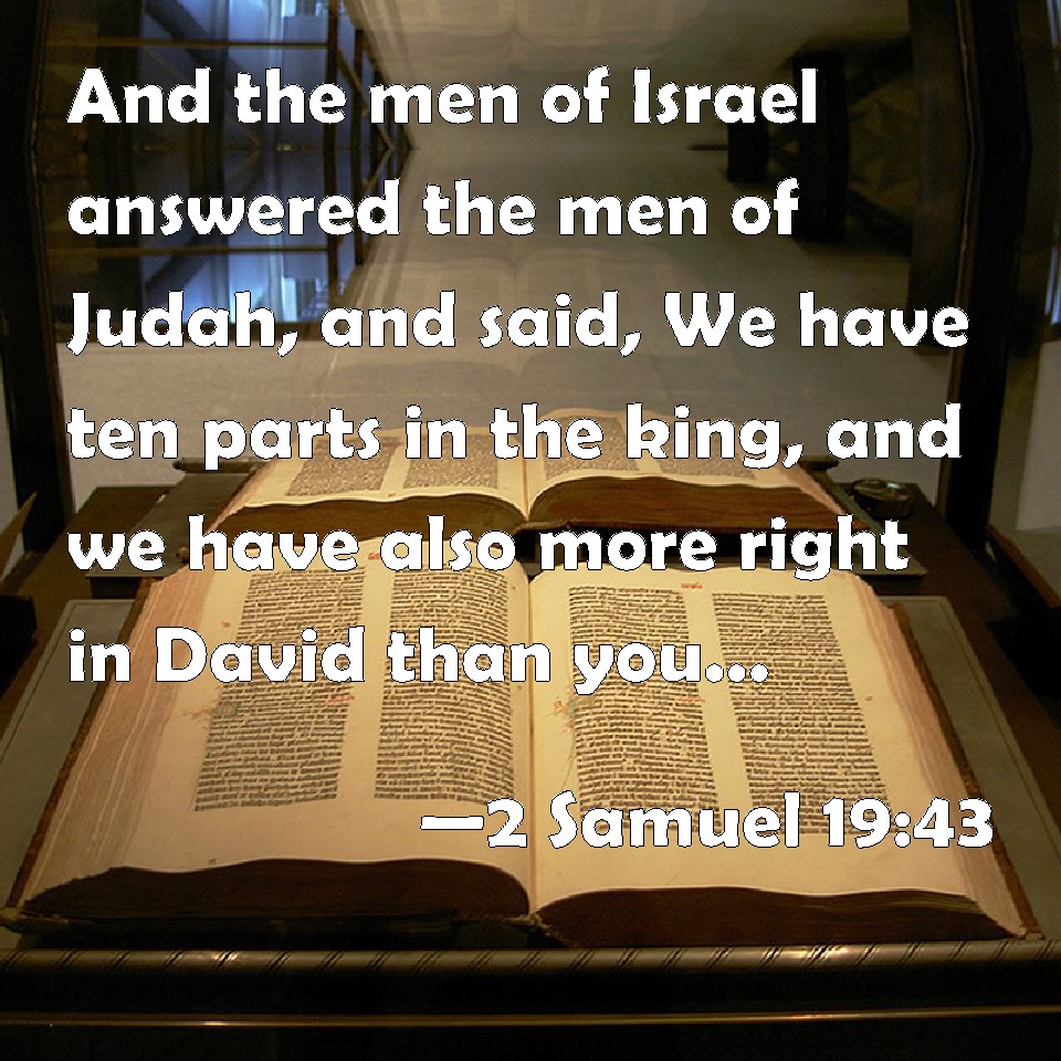 2 Samuel 19:43 And the men of Israel answered the men of Judah, and said, We have ten parts in the king, and we have also more right in David than you: why then did you despise us, that our advice should not be first had in bringing back our king? And the words of the men of Judah were fiercer than the words of the men of Israel.