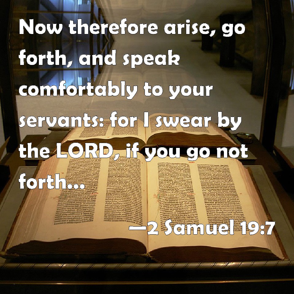Choose a Background 2 Samuel 19:7 Now therefore arise, go forth, and speak comfortably to your servants: for I swear by the LORD, if you go not forth, there will not tarry one with you this night: and that will be worse to you than all the evil that befell you from your youth until now. KJV: Now therefore arise, go forth, and speak comfortably unto thy servants: for I swear by the LORD, if thou go not forth, there will not tarry one with thee this night: and that will be worse unto thee than all the evil that befell thee from thy youth until now. DRB: Now therefore arise, and go out, and speak to the satisfaction of thy servants: for I swear to thee by the Lord, that if thou wilt not go forth, there will not tarry with thee so much as one this night: and that will be worse to thee, than all the evils that have befallen thee from thy youth until now. DBT: But now arise, go forth, and speak consolingly to thy servants; for I swear by Jehovah, if thou go not forth, there will not tarry one with thee this night; and that would be worse to thee than all the evil that has befallen thee from thy youth until now. ERV: Now therefore arise, go forth and speak comfortably unto thy servants: for I swear by the LORD, if thou go not forth, there will not tarry a man with thee this night: and that will be worse unto thee than all the evil that hath befallen thee from thy youth until now. WBT: Now therefore arise, go forth, and speak comfortably to thy servants: for I swear by the LORD, if thou shalt not go forth, there will not tarry one with thee this night: and that will be worse to thee than all the evil that hath befallen thee from thy youth until now. WEB: Now therefore arise, go out, and speak to comfort your servants; for I swear by Yahweh, if you don't go out, not a man will stay with you this night. That would be worse to you than all the evil that has happened to you from your youth until now." YLT: And now, rise, go out and speak unto the heart of thy servants, for by Jehovah I have sworn, that — thou art not going out — there doth not lodge a man with thee to-night; and this is worse for thee than all the evil that hath come upon thee from thy youth till now.'Links 2 Samuel 19:7 NIV • 2 Samuel 19:7 NLT • 2 Samuel 19:7 ESV • 2 Samuel 19:7 NASB • 2 Samuel 19:7 KJV • 2 Samuel 19:7 Interlinear • 2 Samuel 19:7 Commentaries • 2 Samuel 19:7 Parallel Texts • 2 Samuel 19:7 Bible Apps • 2 Samuel 19:7 Parallel • Bible Hub |