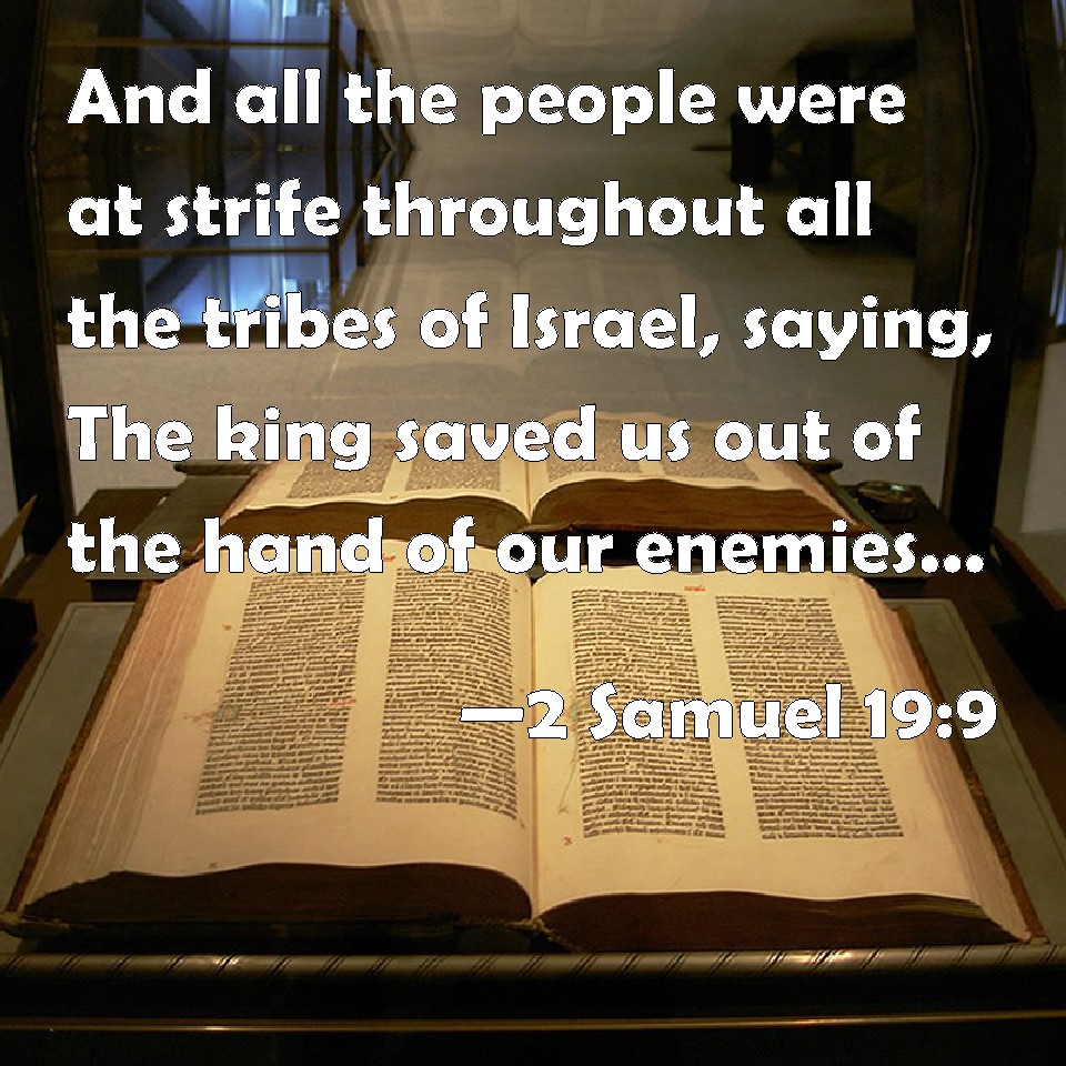 Choose a Background 2 Samuel 19:9 And all the people were at strife throughout all the tribes of Israel, saying, The king saved us out of the hand of our enemies, and he delivered us out of the hand of the Philistines; and now he is fled out of the land for Absalom. KJV: And all the people were at strife throughout all the tribes of Israel, saying, The king saved us out of the hand of our enemies, and he delivered us out of the hand of the Philistines; and now he is fled out of the land for Absalom. DRB: And all the people were at strife in all the tribes of Israel, saying: The king delivered us out of the hand of our enemies, and he saved us out of the hand of the Philistines: and now he is fled out of the land for Absalom. DBT: And all the people were at strife throughout the tribes of Israel, saying, The king delivered us out of the hand of our enemies, and he saved us out of the hand of the Philistines; and now he is fled out of the land because of Absalom. ERV: And all the people were at strife throughout all the tribes of Israel, saying, The king delivered us out of the hand of our enemies, and he saved us out of the hand of the Philistines; and now he is fled out of the land from Absalom. WBT: And all the people were at strife throughout all the tribes of Israel, saying, The king saved us from the hand of our enemies, and he delivered us from the hand of the Philistines; and now he hath fled out of the land for Absalom. WEB: All the people were at strife throughout all the tribes of Israel, saying, "The king delivered us out of the hand of our enemies, and he saved us out of the hand of the Philistines; and now he has fled out of the land from Absalom. YLT: And it cometh to pass, all the people are contending through all the tribes of Israel, saying, 'The king delivered us out of the hand of our enemies, yea, he himself delivered us out of the hand of the Philistines, and now he hath fled out of the land because of Absalom,Links 2 Samuel 19:9 NIV • 2 Samuel 19:9 NLT • 2 Samuel 19:9 ESV • 2 Samuel 19:9 NASB • 2 Samuel 19:9 KJV • 2 Samuel 19:9 Interlinear • 2 Samuel 19:9 Commentaries • 2 Samuel 19:9 Parallel Texts • 2 Samuel 19:9 Bible Apps • 2 Samuel 19:9 Parallel • Bible Hub |