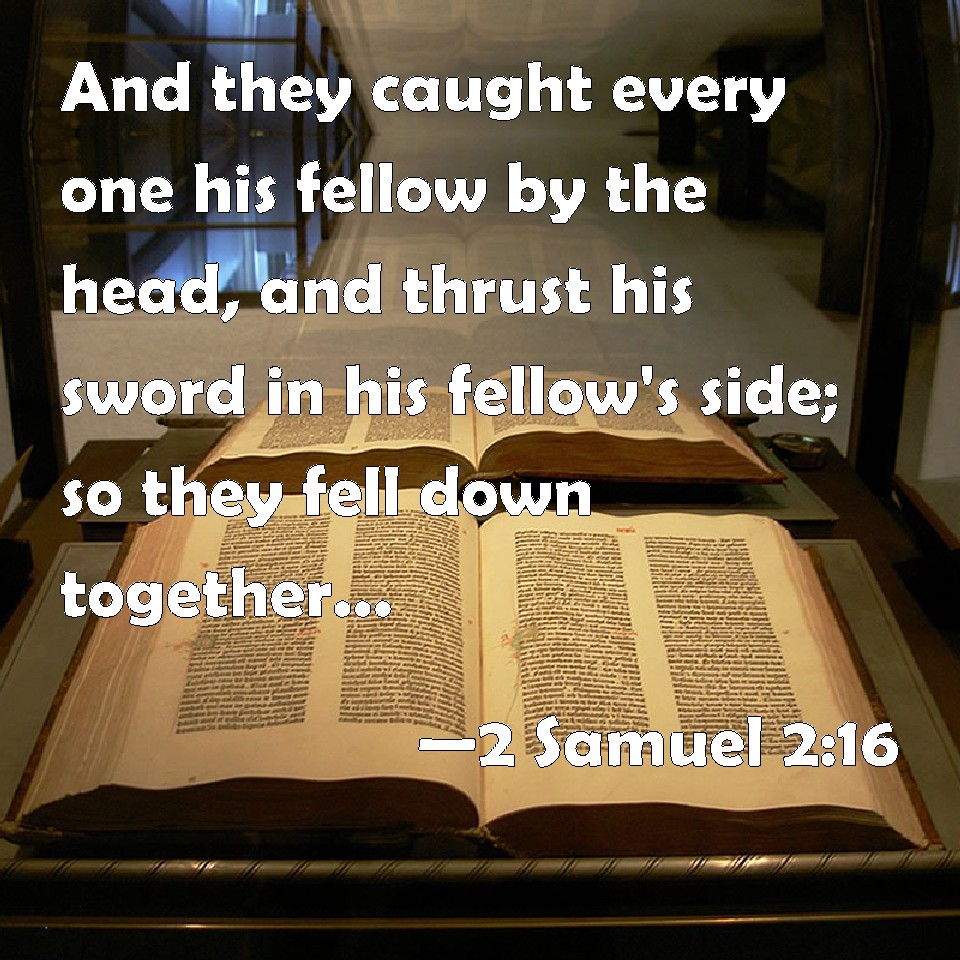 Choose a Background 2 Samuel 2:16 And they caught every one his fellow by the head, and thrust his sword in his fellow's side; so they fell down together: why that place was called Helkathhazzurim, which is in Gibeon. KJV: And they caught every one his fellow by the head, and thrust his sword in his fellow's side; so they fell down together: wherefore that place was called Helkathhazzurim, which is in Gibeon. DRB: And every one catching his fellow, by the head, thrust his sword into the side of his adversary, and they fell down together: and the name of the place was called: The field of the valiant, in Gabaon. DBT: And they caught every one his fellow by the head, and thrust his sword in his fellow's side, and they fell down together. And that place was called Helkath-hazzurim, which is by Gibeon. ERV: And they caught every one his fellow by the head, and thrust his sword in his fellow's side; so they fell down together: wherefore that place was called Helkath-hazzurim, which is in Gibeon. WBT: And they caught every one his fellow by the head, and thrust his sword in his fellow's side: so they fell down together: wherefore that place was called Helkath-hazzurim, which is in Gibeon. WEB: They caught everyone his fellow by the head, and [thrust] his sword in his fellow's side; so they fell down together: therefore that place was called Helkath Hazzurim, which is in Gibeon. YLT: And they lay hold, each on the head of his companion, and his sword is in the side of his companion, and they fall together, and one calleth that place Helkath-Hazzurim, which is in Gibeon,Links 2 Samuel 2:16 NIV • 2 Samuel 2:16 NLT • 2 Samuel 2:16 ESV • 2 Samuel 2:16 NASB • 2 Samuel 2:16 KJV • 2 Samuel 2:16 Interlinear • 2 Samuel 2:16 Commentaries • 2 Samuel 2:16 Parallel Texts • 2 Samuel 2:16 Bible Apps • 2 Samuel 2:16 Parallel • Bible Hub |