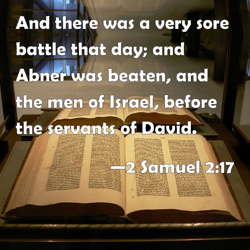 Choose a Background 2 Samuel 2:17 And there was a very sore battle that day; and Abner was beaten, and the men of Israel, before the servants of David. KJV: And there was a very sore battle that day; and Abner was beaten, and the men of Israel, before the servants of David. DRB: And there was a very fierce battle that day: and Abner was put to flight, with the men of Israel, by the servants of David. DBT: And the battle that day was very severe; and Abner and the men of Israel were routed before the servants of David. ERV: And the battle was very sore that day; and Abner was beaten, and the men of Israel, before the servants of David. WBT: And there was a very severe battle that day; and Abner was defeated, and the men of Israel, before the servants of David. WEB: The battle was very severe that day: and Abner was beaten, and the men of Israel, before the servants of David. YLT: and the battle is very hard on that day, and Abner is smitten, and the men of Israel, before the servants of David.Links 2 Samuel 2:17 NIV • 2 Samuel 2:17 NLT • 2 Samuel 2:17 ESV • 2 Samuel 2:17 NASB • 2 Samuel 2:17 KJV • 2 Samuel 2:17 Interlinear • 2 Samuel 2:17 Commentaries • 2 Samuel 2:17 Parallel Texts • 2 Samuel 2:17 Bible Apps • 2 Samuel 2:17 Parallel • Bible Hub |
