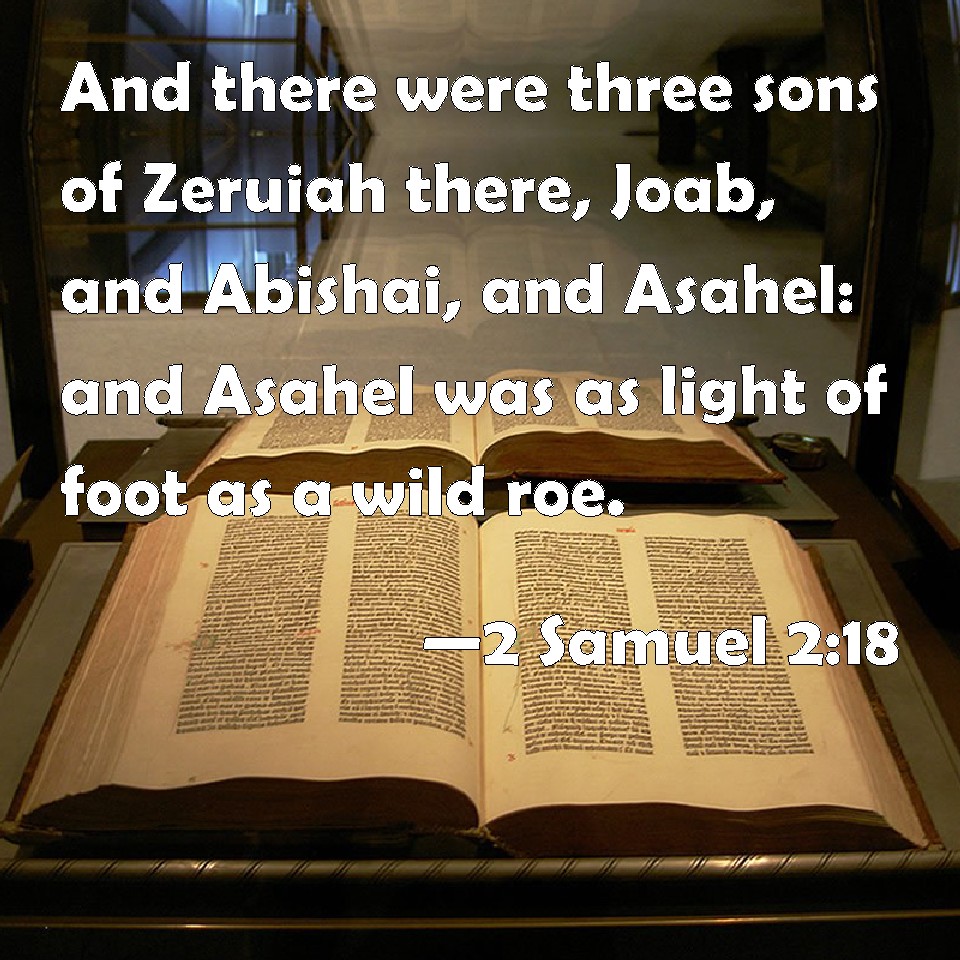 Choose a Background 2 Samuel 2:18 And there were three sons of Zeruiah there, Joab, and Abishai, and Asahel: and Asahel was as light of foot as a wild roe. KJV: And there were three sons of Zeruiah there, Joab, and Abishai, and Asahel: and Asahel was as light of foot as a wild roe. DRB: And there were the three sons of Sarvia there, Joab, and Abisai, and Asael: now Asael was a most swift runner, like one of the roes that abide in the woods. DBT: And there were three sons of Zeruiah there, Joab, and Abishai, and Asahel. Now Asahel was swift of foot, as one of the gazelles that are in the field. ERV: And the three sons of Zeruiah were there, Joab, and Abishai, and Asahel: and Asahel was as light of foot as a wild roe. WBT: And there were three sons of Zeruiah there, Joab, and Abishai, and Asahel: and Asahel was as light of foot as a wild roe. WEB: The three sons of Zeruiah were there, Joab, and Abishai, and Asahel: and Asahel was as light of foot as a wild gazelle. YLT: And there are there three sons of Zeruiah, Joab, and Abishai, and Asahel, and Asahel is light on his feet, as one of the roes which are in the field,Links 2 Samuel 2:18 NIV • 2 Samuel 2:18 NLT • 2 Samuel 2:18 ESV • 2 Samuel 2:18 NASB • 2 Samuel 2:18 KJV • 2 Samuel 2:18 Interlinear • 2 Samuel 2:18 Commentaries • 2 Samuel 2:18 Parallel Texts • 2 Samuel 2:18 Bible Apps • 2 Samuel 2:18 Parallel • Bible Hub |