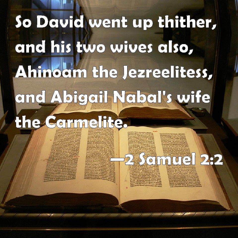 Choose a Background 2 Samuel 2:2 So David went up thither, and his two wives also, Ahinoam the Jezreelitess, and Abigail Nabal's wife the Carmelite. KJV: So David went up thither, and his two wives also, Ahinoam the Jezreelitess, and Abigail Nabal's wife the Carmelite. DRB: So David went up, and his two wives, Achinoam the Jezrahelitess, and Abigail the wife of Nabal of Carmel: DBT: So David went up thither, and his two wives also, Ahinoam the Jizreelitess, and Abigail the wife of Nabal the Carmelite. ERV: So David went up thither, and his two wives also, Ahinoam the Jezreelitess, and Abigail the wife of Nabal the Carmelite. WBT: So David went up thither, and his two wives also, Ahinoam the Jezreelitess, and Abigail, Nabal's wife the Carmelite. WEB: So David went up there, and his two wives also, Ahinoam the Jezreelitess, and Abigail the wife of Nabal the Carmelite. YLT: And David goeth up thither, and also his two wives, Ahinoam the Jezreelitess, and Abigail wife of Nabal the Carmelite;Links 2 Samuel 2:2 NIV • 2 Samuel 2:2 NLT • 2 Samuel 2:2 ESV • 2 Samuel 2:2 NASB • 2 Samuel 2:2 KJV • 2 Samuel 2:2 Interlinear • 2 Samuel 2:2 Commentaries • 2 Samuel 2:2 Parallel Texts • 2 Samuel 2:2 Bible Apps • 2 Samuel 2:2 Parallel • Bible Hub |