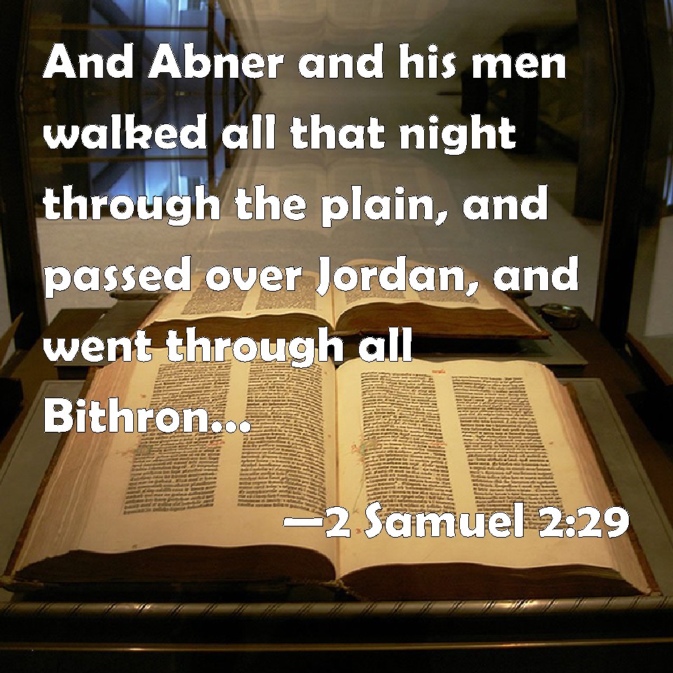 Choose a Background 2 Samuel 2:29 And Abner and his men walked all that night through the plain, and passed over Jordan, and went through all Bithron, and they came to Mahanaim. KJV: And Abner and his men walked all that night through the plain, and passed over Jordan, and went through all Bithron, and they came to Mahanaim. DRB: And Abner and his men walked all that night through the plains: and they passed the Jordan, and having gone through all Beth-horon, came to the camp. DBT: And Abner and his men walked all that night through the plain, and passed over the Jordan, and went through all Bithron, and they came to Mahanaim. ERV: And Abner and his men went all that night through the Arabah; and they passed over Jordan, and went through all Bithron, and came to Mahanaim. WBT: And Abner and his men walked all that night through the plain, and passed over Jordan, and went through all Bithron, and they came to Mahanaim. WEB: Abner and his men went all that night through the Arabah; and they passed over the Jordan, and went through all Bithron, and came to Mahanaim. YLT: And Abner and his men have gone through the plain all that night, and pass over the Jordan, and go on through all Bithron, and come in to Mahanaim.Links 2 Samuel 2:29 NIV • 2 Samuel 2:29 NLT • 2 Samuel 2:29 ESV • 2 Samuel 2:29 NASB • 2 Samuel 2:29 KJV • 2 Samuel 2:29 Interlinear • 2 Samuel 2:29 Commentaries • 2 Samuel 2:29 Parallel Texts • 2 Samuel 2:29 Bible Apps • 2 Samuel 2:29 Parallel • Bible Hub |