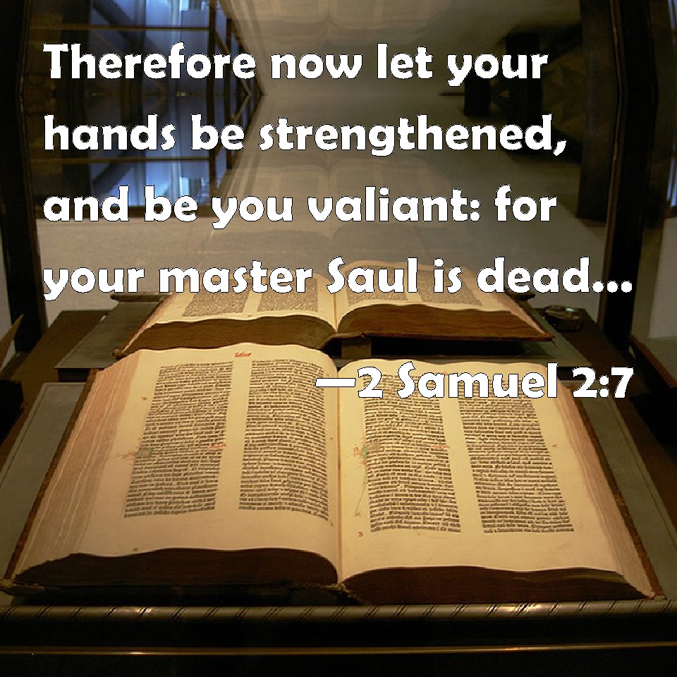Choose a Background 2 Samuel 2:7 Therefore now let your hands be strengthened, and be you valiant: for your master Saul is dead, and also the house of Judah have anointed me king over them. KJV: Therefore now let your hands be strengthened, and be ye valiant: for your master Saul is dead, and also the house of Judah have anointed me king over them. DRB: Let your hands be strengthened, and be ye men of valour: for although your master Saul be dead, yet the house of Juda hath anointed me to be their king. DBT: And now let your hands be strong, and be ye valiant; for your master Saul is dead, and also the house of Judah have anointed me king over them. ERV: Now therefore let your hands be strong, and be ye valiant: for Saul your lord is dead, and also the house of Judah have anointed me king over them. WBT: Therefore now let your hands be strengthened, and be ye valiant: for your master Saul is dead, and also the house of Judah have anointed me king over them. WEB: Now therefore let your hands be strong, and be valiant; for Saul your lord is dead, and also the house of Judah have anointed me king over them." YLT: and now, are your hands strong, and be ye for sons of valour, for your lord Saul. is dead, and also — me have the house of Judah anointed for king over them.'Links 2 Samuel 2:7 NIV • 2 Samuel 2:7 NLT • 2 Samuel 2:7 ESV • 2 Samuel 2:7 NASB • 2 Samuel 2:7 KJV • 2 Samuel 2:7 Interlinear • 2 Samuel 2:7 Commentaries • 2 Samuel 2:7 Parallel Texts • 2 Samuel 2:7 Bible Apps • 2 Samuel 2:7 Parallel • Bible Hub |