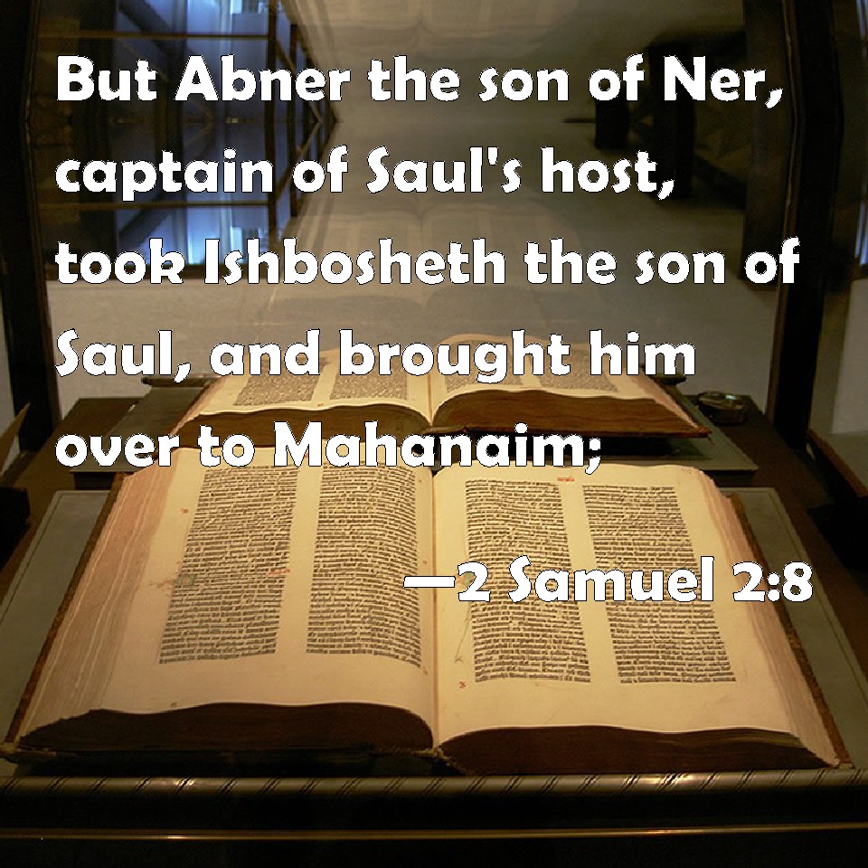 Choose a Background 2 Samuel 2:8 But Abner the son of Ner, captain of Saul's host, took Ishbosheth the son of Saul, and brought him over to Mahanaim; KJV: But Abner the son of Ner, captain of Saul's host, took Ishbosheth the son of Saul, and brought him over to Mahanaim; DRB: But Abner the son of Ner, general of Saul's army, took Isboseth the son of Saul, and led him about through the camp? DBT: And Abner the son of Ner, captain of Saul's host, took Ishbosheth the son of Saul, and brought him over to Mahanaim; ERV: Now Abner the son of Ner, captain of Saul's host, had taken Ish-bosheth the son of Saul, and brought him over to Mahanaim; WBT: But Abner the son of Ner, captain of Saul's host, took Ish-bosheth the son of Saul, and brought him over to Mahanaim; WEB: Now Abner the son of Ner, captain of Saul's army, had taken Ishbosheth the son of Saul, and brought him over to Mahanaim; YLT: And Abner, son of Ner, head of the host which Saul hath, hath taken Ish-Bosheth, son of Saul, and causeth him to pass over to Mahanaim,Links 2 Samuel 2:8 NIV • 2 Samuel 2:8 NLT • 2 Samuel 2:8 ESV • 2 Samuel 2:8 NASB • 2 Samuel 2:8 KJV • 2 Samuel 2:8 Interlinear • 2 Samuel 2:8 Commentaries • 2 Samuel 2:8 Parallel Texts • 2 Samuel 2:8 Bible Apps • 2 Samuel 2:8 Parallel • Bible Hub |