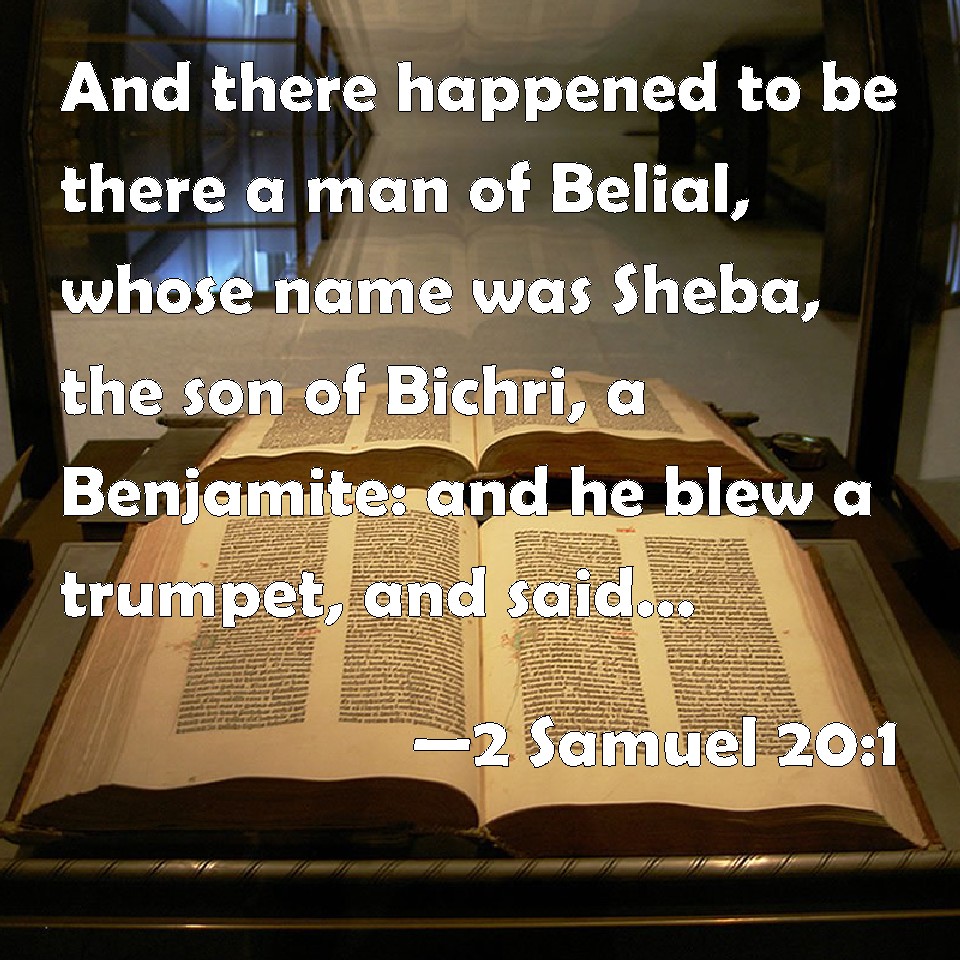 Choose a Background 2 Samuel 20:1 And there happened to be there a man of Belial, whose name was Sheba, the son of Bichri, a Benjamite: and he blew a trumpet, and said, We have no part in David, neither have we inheritance in the son of Jesse: every man to his tents, O Israel. KJV: And there happened to be there a man of Belial, whose name was Sheba, the son of Bichri, a Benjamite: and he blew a trumpet, and said, We have no part in David, neither have we inheritance in the son of Jesse: every man to his tents, O Israel. DRB: And there happened to be there a man of Belial, whose name was Seba, the son of Bochri, a man of Jemini: and he sounded the trumpet, and said: We have no part in David, nor inheritance in the son of Isai: return to thy dwellings, O Israel. DBT: And there happened to be there a man of Belial, whose name was Sheba, the son of Bichri, a Benjaminite; and he blew a trumpet, and said, We have no portion in David, neither have we inheritance in the son of Jesse: every man to his tents, Israel. ERV: And there happened to be there a man of Belial, whose name was Sheba, the son of Bichri, a Benjamite: and he blew the trumpet, and said, We have no portion in David, neither have we inheritance in the son of Jesse: every man to his tents, O Israel. WBT: And there happened to be there a man of Belial, whose name was Sheba, the son of Bichri, a Benjaminite: and he blew a trumpet, and said, We have no part in David, neither have we inheritance in the son of Jesse: every man to his tents, O Israel. WEB: There happened to be there a base fellow, whose name was Sheba, the son of Bichri, a Benjamite: and he blew the trumpet, and said, "We have no portion in David, neither have we inheritance in the son of Jesse. Every man to his tents, Israel!" YLT: And there hath been called there a man of worthlessness, and his name is Sheba, son of Bichri, a Benjamite, and he bloweth with a trumpet, and saith, 'We have no portion in David, and we have no inheritance in the son of Jesse; each to his tents, O Israel.'Links 2 Samuel 20:1 NIV • 2 Samuel 20:1 NLT • 2 Samuel 20:1 ESV • 2 Samuel 20:1 NASB • 2 Samuel 20:1 KJV • 2 Samuel 20:1 Interlinear • 2 Samuel 20:1 Commentaries • 2 Samuel 20:1 Parallel Texts • 2 Samuel 20:1 Bible Apps • 2 Samuel 20:1 Parallel • Bible Hub |
