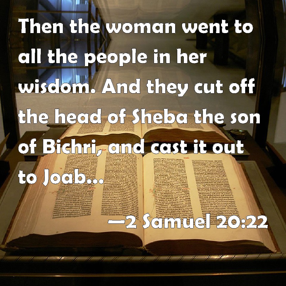 Choose a Background 2 Samuel 20:22 Then the woman went to all the people in her wisdom. And they cut off the head of Sheba the son of Bichri, and cast it out to Joab. And he blew a trumpet, and they retired from the city, every man to his tent. And Joab returned to Jerusalem to the king. KJV: Then the woman went unto all the people in her wisdom. And they cut off the head of Sheba the son of Bichri, and cast it out to Joab. And he blew a trumpet, and they retired from the city, every man to his tent. And Joab returned to Jerusalem unto the king. DRB: So she went to all the people, and spoke to them wisely: and they cut off the head of Seba the son of Bochri, and cast it out to Joab. And he sounded the trumpet, and they departed from the city, every one to their home: and Joab returned to Jerusalem to the king. DBT: Then the woman went to all the people in her wisdom. And they cut off the head of Sheba the son of Bichri, and cast it to Joab. And he blew a trumpet, and they dispersed from the city, every man to his tent. And Joab returned to Jerusalem to the king. ERV: Then the woman went unto all the people in her wisdom. And they cut off the head of Sheba the son of Bichri, and threw it out to Joab. And he blew the trumpet, and they were dispersed from the city, every man to his tent. And Joab returned to Jerusalem unto the king. WBT: Then the woman went to all the people in her wisdom. And they cut off the head of Sheba the son of Bichri, and cast it out to Joab. And he blew a trumpet, and they retired from the city, every man to his tent. And Joab returned to Jerusalem to the king. WEB: Then the woman went to all the people in her wisdom. They cut off the head of Sheba the son of Bichri, and threw it out to Joab. He blew the trumpet, and they were dispersed from the city, every man to his tent. Joab returned to Jerusalem to the king. YLT: And the woman cometh unto all the people in her wisdom, and they cut off the head of Sheba son of Bichri, and cast it unto Joab, and he bloweth with a trumpet, and they are scattered from the city, each to his tents, and Joab hath turned back to Jerusalem unto the king.Links 2 Samuel 20:22 NIV • 2 Samuel 20:22 NLT • 2 Samuel 20:22 ESV • 2 Samuel 20:22 NASB • 2 Samuel 20:22 KJV • 2 Samuel 20:22 Interlinear • 2 Samuel 20:22 Commentaries • 2 Samuel 20:22 Parallel Texts • 2 Samuel 20:22 Bible Apps • 2 Samuel 20:22 Parallel • Bible Hub |