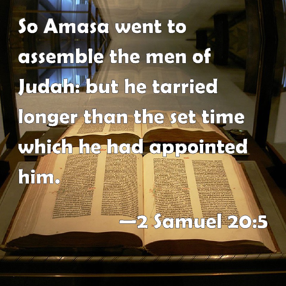 2 Samuel 20:5 So Amasa went to assemble the men of Judah: but he tarried longer than the set time which he had appointed him.