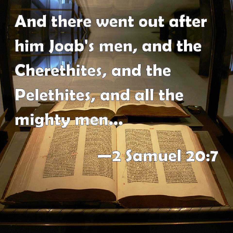 Choose a Background 2 Samuel 20:7 And there went out after him Joab's men, and the Cherethites, and the Pelethites, and all the mighty men: and they went out of Jerusalem, to pursue after Sheba the son of Bichri. KJV: And there went out after him Joab's men, and the Cherethites, and the Pelethites, and all the mighty men: and they went out of Jerusalem, to pursue after Sheba the son of Bichri. DRB: So Joab's men went out with him, and the Cerethi and the Phelethi: and all the valiant men went out of Jerusalem to pursue after Seba the son of Bochri. DBT: And there went out after him Joab's men, and the Cherethites, and the Pelethites, and all the mighty men; and they went out of Jerusalem, to pursue after Sheba the son of Bichri. ERV: And there went out after him Joab's men, and the Cherethites and the Pelethites, and all the mighty men: and they went out of Jerusalem, to pursue after Sheba the son of Bichri. WBT: And there went out after him Joab's men, and the Cherethites, and the Pelethites, and all the mighty men: and they went out of Jerusalem, to pursue after Sheba the son of Bichri. WEB: There went out after him Joab's men, and the Cherethites and the Pelethites, and all the mighty men; and they went out of Jerusalem, to pursue after Sheba the son of Bichri. YLT: And the men of Joab go out after him, and the Cherethite, and the Pelethite, and all the mighty men, and they go out from Jerusalem to pursue after Sheba son of Bichri;Links 2 Samuel 20:7 NIV • 2 Samuel 20:7 NLT • 2 Samuel 20:7 ESV • 2 Samuel 20:7 NASB • 2 Samuel 20:7 KJV • 2 Samuel 20:7 Interlinear • 2 Samuel 20:7 Commentaries • 2 Samuel 20:7 Parallel Texts • 2 Samuel 20:7 Bible Apps • 2 Samuel 20:7 Parallel • Bible Hub |