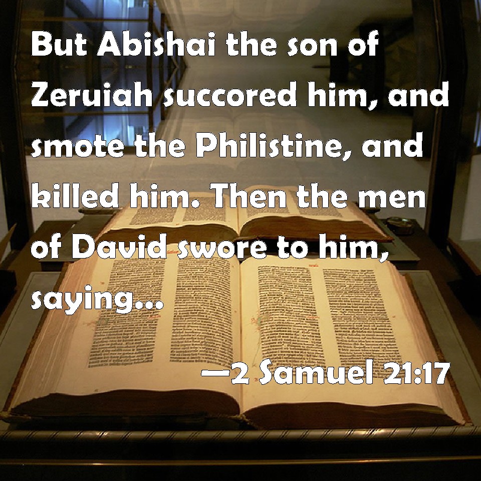 Choose a Background 2 Samuel 21:17 But Abishai the son of Zeruiah succored him, and smote the Philistine, and killed him. Then the men of David swore to him, saying, You shall go no more out with us to battle, that you quench not the light of Israel. KJV: But Abishai the son of Zeruiah succoured him, and smote the Philistine, and killed him. Then the men of David sware unto him, saying, Thou shalt go no more out with us to battle, that thou quench not the light of Israel. DRB: And Abisai the son of Sarvia rescued him, and striking the Philistine killed him. Then David's men swore unto him, saying: Thou shalt go no more out with us to battle, lest thou put out the lamp of Israel. DBT: And Abishai the son of Zeruiah succoured him, and smote the Philistine and killed him. Then the men of David swore to him, saying, Thou shalt go no more out with us to battle, that thou quench not the lamp of Israel. ERV: But Abishai the son of Zeruiah succoured him, and smote the Philistine, and killed him. Then the men of David sware unto him, saying, Thou shalt go no more out with us to battle, that thou quench not the lamp of Israel. WBT: But Abishai the son of Zeruiah succored him, and smote the Philistine, and killed him. Then the men of David swore to him, saying, Thou shalt go out no more with us to battle, that thou mayest not extinguish the light of Israel. WEB: But Abishai the son of Zeruiah helped him, and struck the Philistine, and killed him. Then the men of David swore to him, saying, "You shall go no more out with us to battle, that you don't quench the lamp of Israel." YLT: and Abishai son of Zeruiah giveth help to him, and smiteth the Philistine, and putteth him to death; then swear the men of David to him, saying, 'Thou dost not go out again with us to battle, nor quench the lamp of Israel.'Links 2 Samuel 21:17 NIV • 2 Samuel 21:17 NLT • 2 Samuel 21:17 ESV • 2 Samuel 21:17 NASB • 2 Samuel 21:17 KJV • 2 Samuel 21:17 Interlinear • 2 Samuel 21:17 Commentaries • 2 Samuel 21:17 Parallel Texts • 2 Samuel 21:17 Bible Apps • 2 Samuel 21:17 Parallel • Bible Hub |