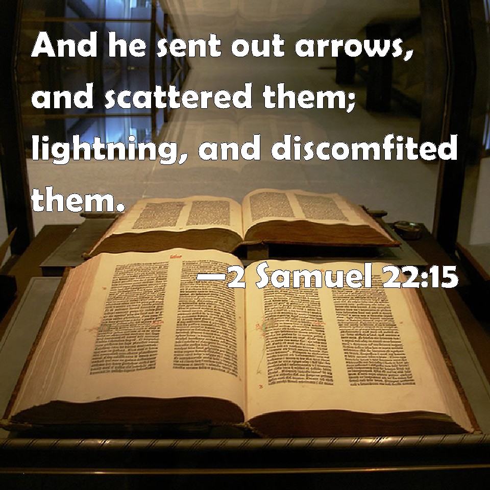 Choose a Background 2 Samuel 22:15 And he sent out arrows, and scattered them; lightning, and discomfited them. KJV: And he sent out arrows, and scattered them; lightning, and discomfited them. DRB: He shot arrows and scattered them: lightning, and consumed them. DBT: And he sent arrows, and scattered mine enemies; Lightning, and discomfited them. ERV: And he sent out arrows, and scattered them; lightning, and discomfited them. WBT: And he sent out arrows, and scattered them; lightning, and discomfited them. WEB: He sent out arrows, and scattered them; lightning, and confused them. YLT: And He sendeth forth arrows, And scattereth them; Lightning, and troubleth them;Links 2 Samuel 22:15 NIV • 2 Samuel 22:15 NLT • 2 Samuel 22:15 ESV • 2 Samuel 22:15 NASB • 2 Samuel 22:15 KJV • 2 Samuel 22:15 Interlinear • 2 Samuel 22:15 Commentaries • 2 Samuel 22:15 Parallel Texts • 2 Samuel 22:15 Bible Apps • 2 Samuel 22:15 Parallel • Bible Hub |