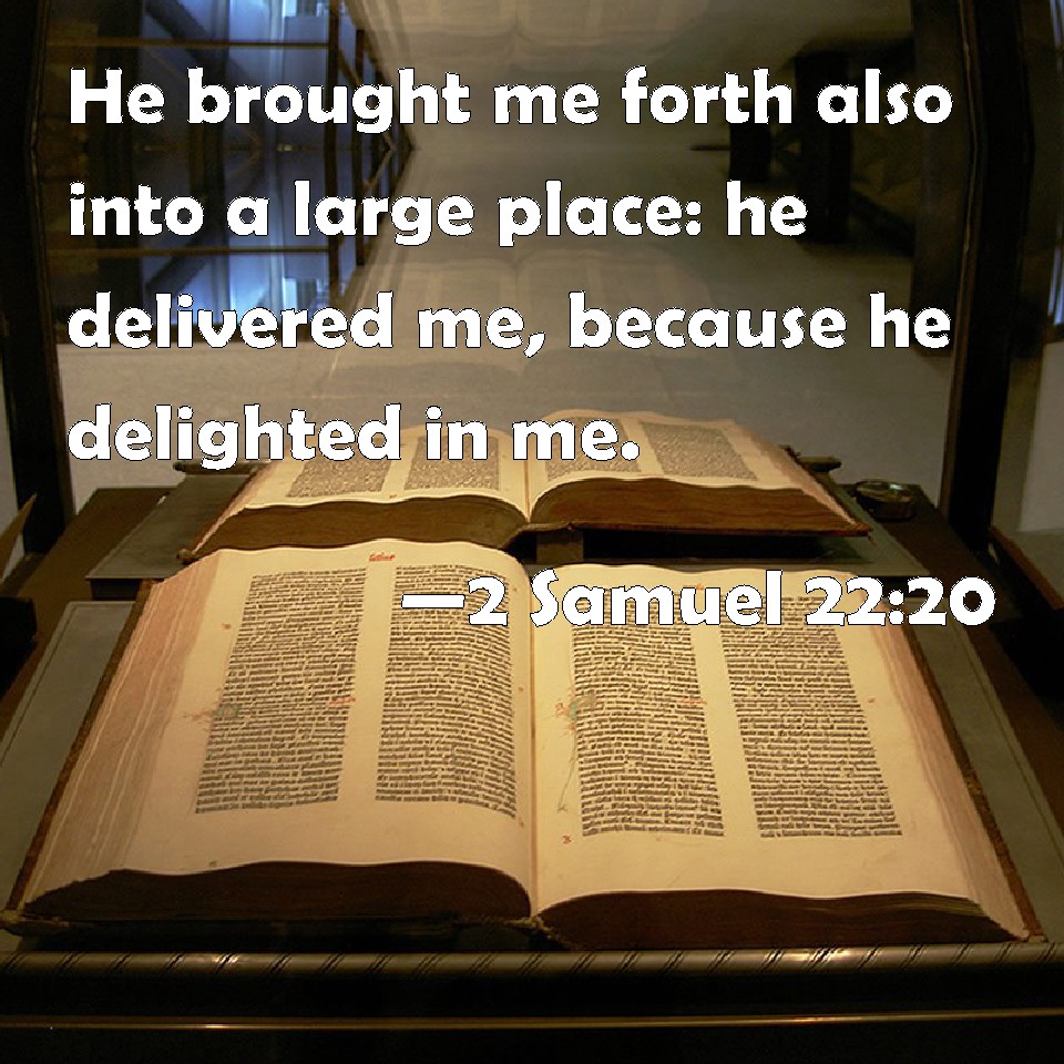 2 Samuel 22:20 He brought me forth also into a large place: he delivered me, because he delighted in me.