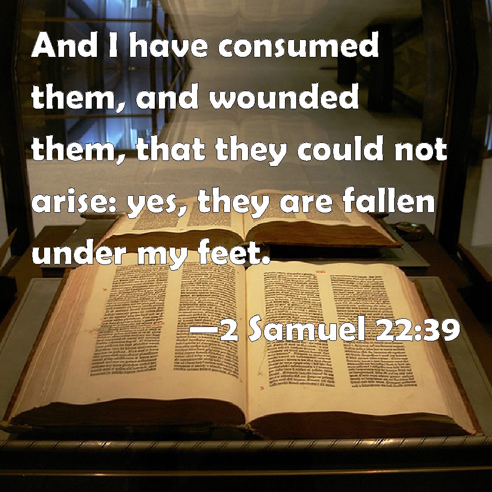 Choose a Background 2 Samuel 22:39 And I have consumed them, and wounded them, that they could not arise: yes, they are fallen under my feet. KJV: And I have consumed them, and wounded them, that they could not arise: yea, they are fallen under my feet. DRB: I will consume them and break them in pieces, so that they shall not rise: they shall fall under my feet. DBT: And I have consumed them and have crushed them, and they rose not again; Yea, they fell under my feet. ERV: And I have consumed them, and smitten them through, that they cannot arise; yea, they are fallen under my feet. WBT: And I have consumed them, and wounded them, that they could not arise: yea, they have fallen under my feet. WEB: I have consumed them, and struck them through, so that they can't arise. Yes, they have fallen under my feet. YLT: And I consume them, and smite them, And they rise not, and fall under my feet.Links 2 Samuel 22:39 NIV • 2 Samuel 22:39 NLT • 2 Samuel 22:39 ESV • 2 Samuel 22:39 NASB • 2 Samuel 22:39 KJV • 2 Samuel 22:39 Interlinear • 2 Samuel 22:39 Commentaries • 2 Samuel 22:39 Parallel Texts • 2 Samuel 22:39 Bible Apps • 2 Samuel 22:39 Parallel • Bible Hub |