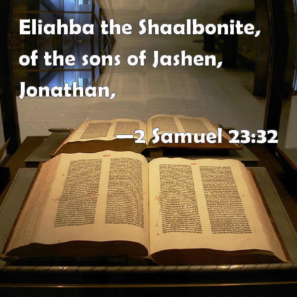 Choose a Background 2 Samuel 23:32 Eliahba the Shaalbonite, of the sons of Jashen, Jonathan, KJV: Eliahba the Shaalbonite, of the sons of Jashen, Jonathan, DRB: Eliaba of Salaboni. The sons of Jassen, Jonathan, DBT: Eliahba the Shaalbonite, of the sons of Jashen, Jonathan, ERV: Eliahba the Shaalbonite, the sons of Jashen, Jonathan; WBT: Eliahba the Shaalbonite, of the sons of Jashen, Jonathan, WEB: Eliahba the Shaalbonite, the sons of Jashen, Jonathan, YLT: Eliahba the Shaalbonite, of the sons of Jashen, Jonathan,Links 2 Samuel 23:32 NIV • 2 Samuel 23:32 NLT • 2 Samuel 23:32 ESV • 2 Samuel 23:32 NASB • 2 Samuel 23:32 KJV • 2 Samuel 23:32 Interlinear • 2 Samuel 23:32 Commentaries • 2 Samuel 23:32 Parallel Texts • 2 Samuel 23:32 Bible Apps • 2 Samuel 23:32 Parallel • Bible Hub |