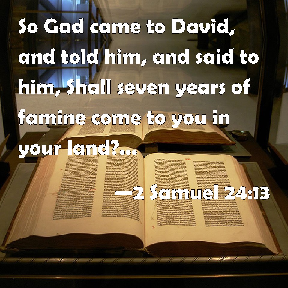 Choose a Background 2 Samuel 24:13 So Gad came to David, and told him, and said to him, Shall seven years of famine come to you in your land? or will you flee three months before your enemies, while they pursue you? or that there be three days' pestilence in your land? now advise, and see what answer I shall return to him that sent me. KJV: So Gad came to David, and told him, and said unto him, Shall seven years of famine come unto thee in thy land? or wilt thou flee three months before thine enemies, while they pursue thee? or that there be three days' pestilence in thy land? now advise, and see what answer I shall return to him that sent me. DRB: And when Gad was come to David, he told him, saying: Either seven years of famine shall come to thee in thy land: or thou shalt flee three months before thy adversaries, and they shall pursue thee: or for three days there shall be a pestilence in thy land. Now therefore deliberate, and see what answer I shall return to him that sent me. DBT: And Gad came to David, and told him, and said to him, Shall seven years of famine come to thee in thy land? or wilt thou flee three months before thine adversaries while they pursue thee? or shall there be three days' pestilence in thy land? Now be aware and consider what word I shall bring again to him that sent me. ERV: So Gad came to David, and told him, and said unto him, Shall seven years of famine come unto thee in thy land? or wilt thou flee three months before thy foes while they pursue thee? or shall there be three days pestilence in thy land? now advise thee, and consider what answer I shall return to him that sent me. WBT: So Gad came to David, and told him, and said to him, Shall seven years of famine come upon thee in thy land? or wilt thou flee three months before thy enemies, while they pursue thee? or that there be three days' pestilence in thy land? Now consider, and see what answer I shall return to him that sent me. WEB: So Gad came to David, and told him, and said to him, "Shall seven years of famine come to you in your land? Or will you flee three months before your foes while they pursue you? Or shall there be three days' pestilence in your land? Now answer, and consider what answer I shall return to him who sent me." YLT: And Gad cometh in unto David, and declareth to him, and saith to him, 'Do seven years of famine come in to thee in thy land? or three months art thou fleeing before thine adversary — and he pursuing thee? or are three days' pestilence in thy land? now, know and see what word I take back to Him sending me.'Links 2 Samuel 24:13 NIV • 2 Samuel 24:13 NLT • 2 Samuel 24:13 ESV • 2 Samuel 24:13 NASB • 2 Samuel 24:13 KJV • 2 Samuel 24:13 Interlinear • 2 Samuel 24:13 Commentaries • 2 Samuel 24:13 Parallel Texts • 2 Samuel 24:13 Bible Apps • 2 Samuel 24:13 Parallel • Bible Hub |