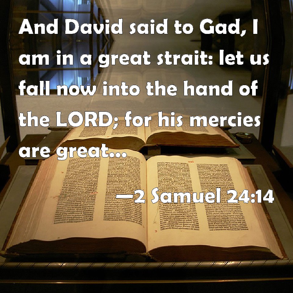 Choose a Background 2 Samuel 24:14 And David said to Gad, I am in a great strait: let us fall now into the hand of the LORD; for his mercies are great: and let me not fall into the hand of man. KJV: And David said unto Gad, I am in a great strait: let us fall now into the hand of the LORD; for his mercies are great: and let me not fall into the hand of man. DRB: And David said to Gad: I am in a great strait: but it is better that I should fall into the hands of the Lord (for his mercies are many) than into the hands of men. DBT: And David said to Gad, I am in a great strait: let us fall, I pray thee, into the hand of Jehovah; for his mercies are great; but let me not fall into the hand of man. ERV: And David said unto Gad, I am in a great strait: let us fall now into the hand of the LORD; for his mercies are great: and let me not fall into the hand of man. WBT: And David said to Gad, I am in a great strait: let us fall now into the hand of the LORD; for his mercies are great: and let me not fall into the hand of man. WEB: David said to Gad, "I am in distress. Let us fall now into the hand of Yahweh; for his mercies are great. Let me not fall into the hand of man." YLT: And David saith unto Gad, 'I have great distress, let us fall, I pray thee, into the hand of Jehovah, for many are His mercies, and into the hand of man let me not fall.'Links 2 Samuel 24:14 NIV • 2 Samuel 24:14 NLT • 2 Samuel 24:14 ESV • 2 Samuel 24:14 NASB • 2 Samuel 24:14 KJV • 2 Samuel 24:14 Interlinear • 2 Samuel 24:14 Commentaries • 2 Samuel 24:14 Parallel Texts • 2 Samuel 24:14 Bible Apps • 2 Samuel 24:14 Parallel • Bible Hub |