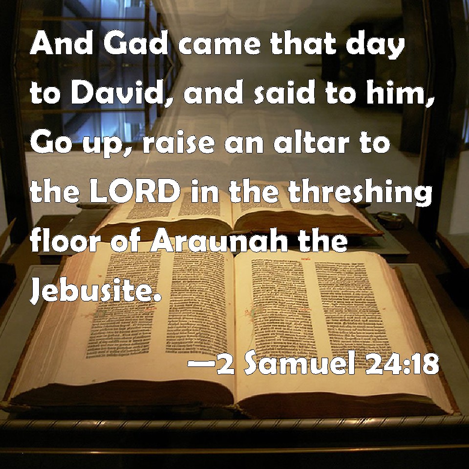 Choose a Background 2 Samuel 24:18 And Gad came that day to David, and said to him, Go up, raise an altar to the LORD in the threshing floor of Araunah the Jebusite. KJV: And Gad came that day to David, and said unto him, Go up, rear an altar unto the LORD in the threshingfloor of Araunah the Jebusite. DRB: And Gad came to David that day, and said: Go up, and build an altar to the Lord in the thrashingfloor of Areuna the Jebusite. DBT: And Gad came that day to David, and said to him, Go up, rear an altar to Jehovah in the threshing-floor of Araunah the Jebusite. ERV: And Gad came that day to David, and said unto him, Go up, rear an altar unto the LORD in the threshing-floor of Araunah the Jebusite. WBT: And Gad came that day to David, and said to him, Go up, rear an altar to the LORD in the threshing-floor of Araunah the Jebusite. WEB: Gad came that day to David, and said to him, "Go up, build an altar to Yahweh on the threshing floor of Araunah the Jebusite." YLT: And Gad cometh in unto David on that day, and saith to him, 'Go up, raise to Jehovah an altar in the threshing-floor of Araunah the Jebusite;'Links 2 Samuel 24:18 NIV • 2 Samuel 24:18 NLT • 2 Samuel 24:18 ESV • 2 Samuel 24:18 NASB • 2 Samuel 24:18 KJV • 2 Samuel 24:18 Interlinear • 2 Samuel 24:18 Commentaries • 2 Samuel 24:18 Parallel Texts • 2 Samuel 24:18 Bible Apps • 2 Samuel 24:18 Parallel • Bible Hub |