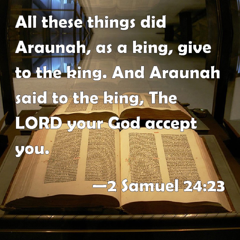 Choose a Background 2 Samuel 24:23 All these things did Araunah, as a king, give to the king. And Araunah said to the king, The LORD your God accept you. KJV: All these things did Araunah, as a king, give unto the king. And Araunah said unto the king, The LORD thy God accept thee. DRB: All these things Areuna as a king gave to the king: and Areuna said to the king: The Lord thy God receive thy vow. DBT: All these things, O king, doth Araunah give to the king. And Araunah said to the king, Jehovah thy God accept thee. ERV: all this, O king, doth Araunah give unto the king. And Araunah said unto the king, The LORD thy God accept thee. WBT: All these things did Araunah, as a king, give to the king. And Araunah said to the king, The LORD thy God accept thee. WEB: all this, king, does Araunah give to the king." Araunah said to the king, "May Yahweh your God accept you." YLT: the whole hath Araunah given, as a king to a king; and Araunah saith unto the king, 'Jehovah thy God doth accept thee.'Links 2 Samuel 24:23 NIV • 2 Samuel 24:23 NLT • 2 Samuel 24:23 ESV • 2 Samuel 24:23 NASB • 2 Samuel 24:23 KJV • 2 Samuel 24:23 Interlinear • 2 Samuel 24:23 Commentaries • 2 Samuel 24:23 Parallel Texts • 2 Samuel 24:23 Bible Apps • 2 Samuel 24:23 Parallel • Bible Hub |
