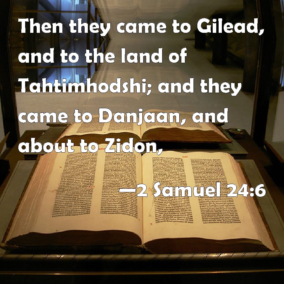 Choose a Background 2 Samuel 24:6 Then they came to Gilead, and to the land of Tahtimhodshi; and they came to Danjaan, and about to Zidon, KJV: Then they came to Gilead, and to the land of Tahtimhodshi; and they came to Danjaan, and about to Zidon, DRB: And by Jazer they passed into Galaad, and to the lower land of Hodsi, and they came into the woodlands of Dan. And going about by Sidon, DBT: And they came to Gilead, and to the land of Tahtim-hodshi; and came to Dan-jaan, and to the environs of Sidon; ERV: then they came to Gilead, and to the land of Tahtim-hodshi; and they came to Dan-jaan, and round about to Zidon, WBT: Then they came to Gilead, and to the land of Tahtim-hodshi; and they came to Dan-jaan, and about to Zidon, WEB: then they came to Gilead, and to the land of Tahtim Hodshi; and they came to Dan Jaan, and around to Sidon, YLT: and they come in to Gilead, and unto the land of Tahtim-Hodshi, and they come in to Dan-Jaan, and round about unto Zidon,Links 2 Samuel 24:6 NIV • 2 Samuel 24:6 NLT • 2 Samuel 24:6 ESV • 2 Samuel 24:6 NASB • 2 Samuel 24:6 KJV • 2 Samuel 24:6 Interlinear • 2 Samuel 24:6 Commentaries • 2 Samuel 24:6 Parallel Texts • 2 Samuel 24:6 Bible Apps • 2 Samuel 24:6 Parallel • Bible Hub |