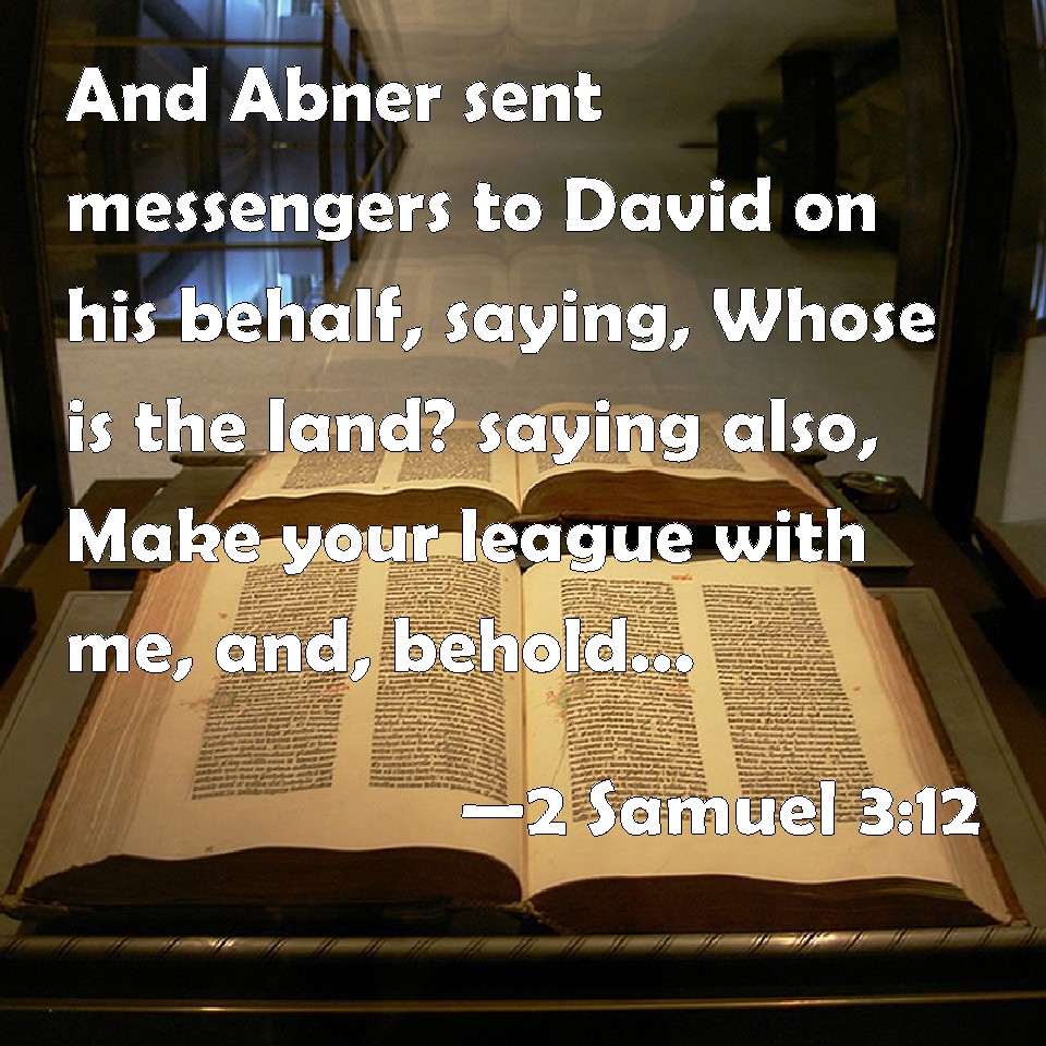 Choose a Background 2 Samuel 3:12 And Abner sent messengers to David on his behalf, saying, Whose is the land? saying also, Make your league with me, and, behold, my hand shall be with you, to bring about all Israel to you. KJV: And Abner sent messengers to David on his behalf, saying, Whose is the land? saying also, Make thy league with me, and, behold, my hand shall be with thee, to bring about all Israel unto thee. DRB: Abner therefore sent messengers to David for himself, saying: Whose is the land? and that they should say: Make a league with me, and my hand shall be with thee: and I will bring all Israel to thee. DBT: And Abner sent messengers to David on his behalf, saying, Whose is the land? saying also, Make thy covenant with me, and behold, my hand shall be with thee, to turn all Israel to thee. ERV: And Abner sent messengers to David on his behalf, saying, Whose is the land? saying also, Make thy league with me, and, behold, my hand shall be with thee, to bring about all Israel unto thee. WBT: And Abner sent messengers to David on his behalf, saying, Whose is the land? saying also, Make thy league with me, and behold, my hand shall be with thee, to bring about all Israel to thee. WEB: Abner sent messengers to David on his behalf, saying, "Whose is the land?" and saying, "Make your alliance with me, and behold, my hand shall be with you, to bring all Israel around to you." YLT: And Abner sendeth messengers unto David for himself, saying, 'Whose is the land?' saying, 'Make thy covenant with me, and lo, my hand is with thee, to bring round unto thee all Israel.'Links 2 Samuel 3:12 NIV • 2 Samuel 3:12 NLT • 2 Samuel 3:12 ESV • 2 Samuel 3:12 NASB • 2 Samuel 3:12 KJV • 2 Samuel 3:12 Interlinear • 2 Samuel 3:12 Commentaries • 2 Samuel 3:12 Parallel Texts • 2 Samuel 3:12 Bible Apps • 2 Samuel 3:12 Parallel • Bible Hub |