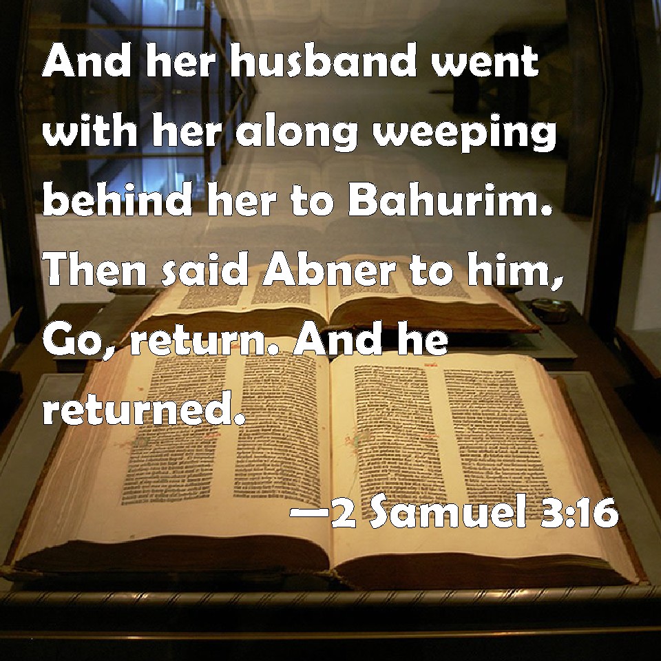 Choose a Background 2 Samuel 3:16 And her husband went with her along weeping behind her to Bahurim. Then said Abner to him, Go, return. And he returned. KJV: And her husband went with her along weeping behind her to Bahurim. Then said Abner unto him, Go, return. And he returned. DRB: And her husband followed her, weeping as far as Bahurim: and Abner said to him: Go and return. And he returned. DBT: And her husband went with her along weeping behind her to Bahurim. Then said Abner to him, Go, return. And he returned. ERV: And her husband went with her, weeping as he went, and followed her to Bahurim. Then said Abner unto him, Go, return: and he returned. WBT: And her husband went with her, weeping behind her to Bahurim. Then said Abner to him, Go, return. And he returned. WEB: Her husband went with her, weeping as he went, and followed her to Bahurim. Then Abner said to him, "Go! Return!" and he returned. YLT: and her husband goeth with her, going on and weeping behind her, unto Bahurim, and Abner saith unto him, 'Go, turn back;' and he turneth back.Links 2 Samuel 3:16 NIV • 2 Samuel 3:16 NLT • 2 Samuel 3:16 ESV • 2 Samuel 3:16 NASB • 2 Samuel 3:16 KJV • 2 Samuel 3:16 Interlinear • 2 Samuel 3:16 Commentaries • 2 Samuel 3:16 Parallel Texts • 2 Samuel 3:16 Bible Apps • 2 Samuel 3:16 Parallel • Bible Hub |
