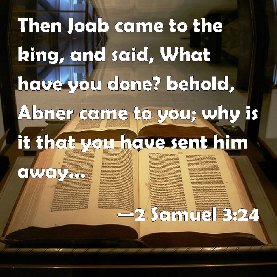 Choose a Background 2 Samuel 3:24 Then Joab came to the king, and said, What have you done? behold, Abner came to you; why is it that you have sent him away, and he is quite gone? KJV: Then Joab came to the king, and said, What hast thou done? behold, Abner came unto thee; why is it that thou hast sent him away, and he is quite gone? DRB: And Joab went in to the king, and said: What hast thou done? Behold Abner came to thee: Why didst thou send him away, and he is gone and departed? DBT: Then Joab came to the king, and said, What hast thou done? behold, Abner came to thee; why is it that thou hast sent him away, and he is gone? ERV: Then Joab came to the king, and said, What hast thou done? behold, Abner came unto thee; why is it that thou hast sent him away, and he is quite gone? WBT: Then Joab came to the king, and said, What hast thou done? behold, Abner came to thee; why is it that thou hast sent him away, and he is quite gone? WEB: Then Joab came to the king, and said, "What have you done? Behold, Abner came to you. Why is it that you have sent him away, and he is quite gone? YLT: And Joab cometh unto the king, and saith, 'What hast thou done? lo, Abner hath come unto thee! why is this — thou hast sent him away, and he is really gone?Links 2 Samuel 3:24 NIV • 2 Samuel 3:24 NLT • 2 Samuel 3:24 ESV • 2 Samuel 3:24 NASB • 2 Samuel 3:24 KJV • 2 Samuel 3:24 Interlinear • 2 Samuel 3:24 Commentaries • 2 Samuel 3:24 Parallel Texts • 2 Samuel 3:24 Bible Apps • 2 Samuel 3:24 Parallel • Bible Hub |