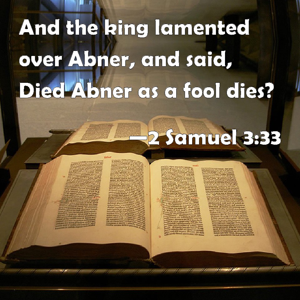 Choose a Background 2 Samuel 3:33 And the king lamented over Abner, and said, Died Abner as a fool dies? KJV: And the king lamented over Abner, and said, Died Abner as a fool dieth? DRB: And the king mourning and lamenting over Abner, said: Not as cowards are wont to die, hath Abner died. DBT: And the king lamented over Abner, and said, Should Abner die as a fool dieth? ERV: And the king lamented for Abner, and said, Should Abner die as a fool dieth? WBT: And the king lamented over Abner, and said, Died Abner as a fool dieth? WEB: The king lamented for Abner, and said, "Should Abner die as a fool dies? YLT: and the king lamenteth for Abner, and saith: — 'As the death of a fool doth Abner die?Links 2 Samuel 3:33 NIV • 2 Samuel 3:33 NLT • 2 Samuel 3:33 ESV • 2 Samuel 3:33 NASB • 2 Samuel 3:33 KJV • 2 Samuel 3:33 Interlinear • 2 Samuel 3:33 Commentaries • 2 Samuel 3:33 Parallel Texts • 2 Samuel 3:33 Bible Apps • 2 Samuel 3:33 Parallel • Bible Hub |