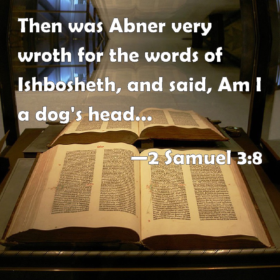 Choose a Background 2 Samuel 3:8 Then was Abner very wroth for the words of Ishbosheth, and said, Am I a dog's head, which against Judah do show kindness this day to the house of Saul your father, to his brothers, and to his friends, and have not delivered you into the hand of David, that you charge me to day with a fault concerning this woman? KJV: Then was Abner very wroth for the words of Ishbosheth, and said, Am I a dog's head, which against Judah do shew kindness this day unto the house of Saul thy father, to his brethren, and to his friends, and have not delivered thee into the hand of David, that thou chargest me to day with a fault concerning this woman? DRB: Why didst thou go in to my father's concubine? And he was exceedingly angry for the words of Isboseth, and said: Am I a dog's head against Juda this day, who have shewn mercy to the house of Saul thy father, and to his brethren and friends, and have not delivered thee into the hands of David, and hast thou sought this day against me to charge me with a matter concerning a woman? DBT: Then was Abner very wroth for the words of Ishbosheth, and said, Am I a dog's head, I who against Judah do shew kindness this day to the house of Saul thy father, to his brethren, and to his friends, and have not delivered thee into the hand of David, that thou reproachest me this day with the fault of this woman? ERV: Then was Abner very wroth for the words of Ish-bosheth, and said, Am I a dog's head that belongeth to Judah? This day do I shew kindness unto the house of Saul thy father, to his brethren, and to his friends, and have not delivered thee into the hand of David, and yet thou chargest me this day with a fault concerning this woman. WBT: Then was Abner very wroth for the words of Ish-bosheth, and said, Am I a dog's head, who against Judah do show kindness this day to the house of Saul thy father, to his brethren, and to his friends, and have not delivered thee into the hand of David, that thou chargest me to-day with a fault concerning this woman? WEB: Then was Abner very angry for the words of Ishbosheth, and said, "Am I a dog's head that belongs to Judah? Today I show kindness to the house of Saul your father, to his brothers, and to his friends, and have not delivered you into the hand of David; and yet you charge me this day with a fault concerning this woman! YLT: And it is displeasing to Abner exceedingly, because of the words of Ish-Bosheth, and he saith, 'The head of a dog am I — that in reference to Judah to-day I do kindness with the house of Saul thy father, unto his brethren, and unto his friends, and have not delivered thee into the hand of David — that thou chargest against me iniquity concerning the woman to-day?Links 2 Samuel 3:8 NIV • 2 Samuel 3:8 NLT • 2 Samuel 3:8 ESV • 2 Samuel 3:8 NASB • 2 Samuel 3:8 KJV • 2 Samuel 3:8 Interlinear • 2 Samuel 3:8 Commentaries • 2 Samuel 3:8 Parallel Texts • 2 Samuel 3:8 Bible Apps • 2 Samuel 3:8 Parallel • Bible Hub |