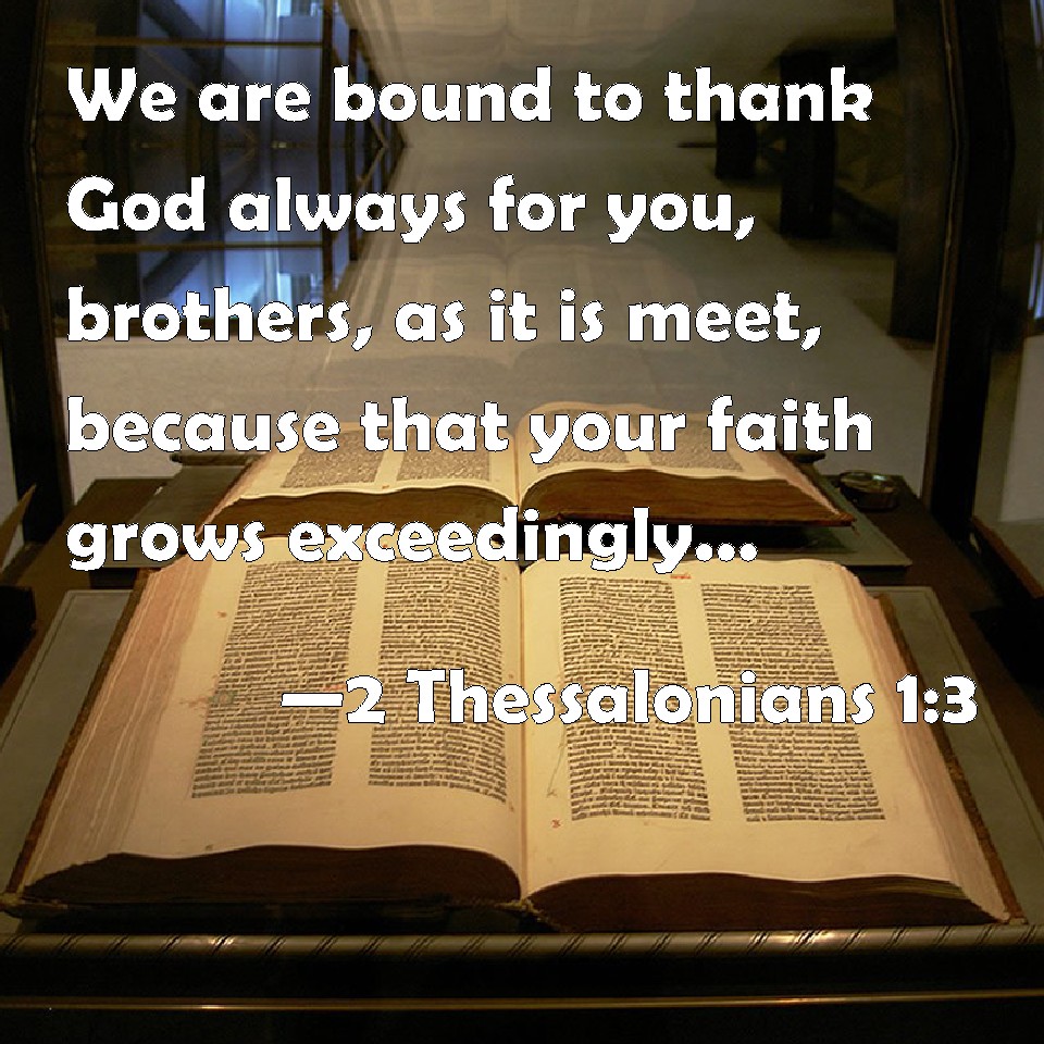 Choose a Background 2 Thessalonians 1:3 We are bound to thank God always for you, brothers, as it is meet, because that your faith grows exceedingly, and the charity of every one of you all toward each other abounds; KJV: We are bound to thank God always for you, brethren, as it is meet, because that your faith groweth exceedingly, and the charity of every one of you all toward each other aboundeth; DRB: We are bound to give thanks always to God for you, brethren, as it is fitting, because your faith groweth exceedingly, and the charity of every one of you towards each other, aboundeth: DBT: We ought to thank God always for you, brethren, even as it is meet, because your faith increases exceedingly, and the love of each one of you all towards one another abounds; ERV: We are bound to give thanks to God alway for you, brethren, even as it is meet, for that your faith groweth exceedingly, and the love of each one of you all toward one another aboundeth; WBT: We are bound to thank God always for you, brethren, as it is meet, because your faith groweth exceedingly, and the charity of every one of you all towards each other aboundeth; WEB: We are bound to always give thanks to God for you, brothers, even as it is appropriate, because your faith grows exceedingly, and the love of each and every one of you towards one another abounds; YLT: We ought to give thanks to God always for you, brethren, as it is meet, because increase greatly doth your faith, and abound doth the love of each one of you all, to one another;Links 2 Thessalonians 1:3 NIV • 2 Thessalonians 1:3 NLT • 2 Thessalonians 1:3 ESV • 2 Thessalonians 1:3 NASB • 2 Thessalonians 1:3 KJV • 2 Thessalonians 1:3 Interlinear • 2 Thessalonians 1:3 Commentaries • 2 Thessalonians 1:3 Parallel Texts • 2 Thessalonians 1:3 Bible Apps • 2 Thessalonians 1:3 Parallel • Bible Hub |