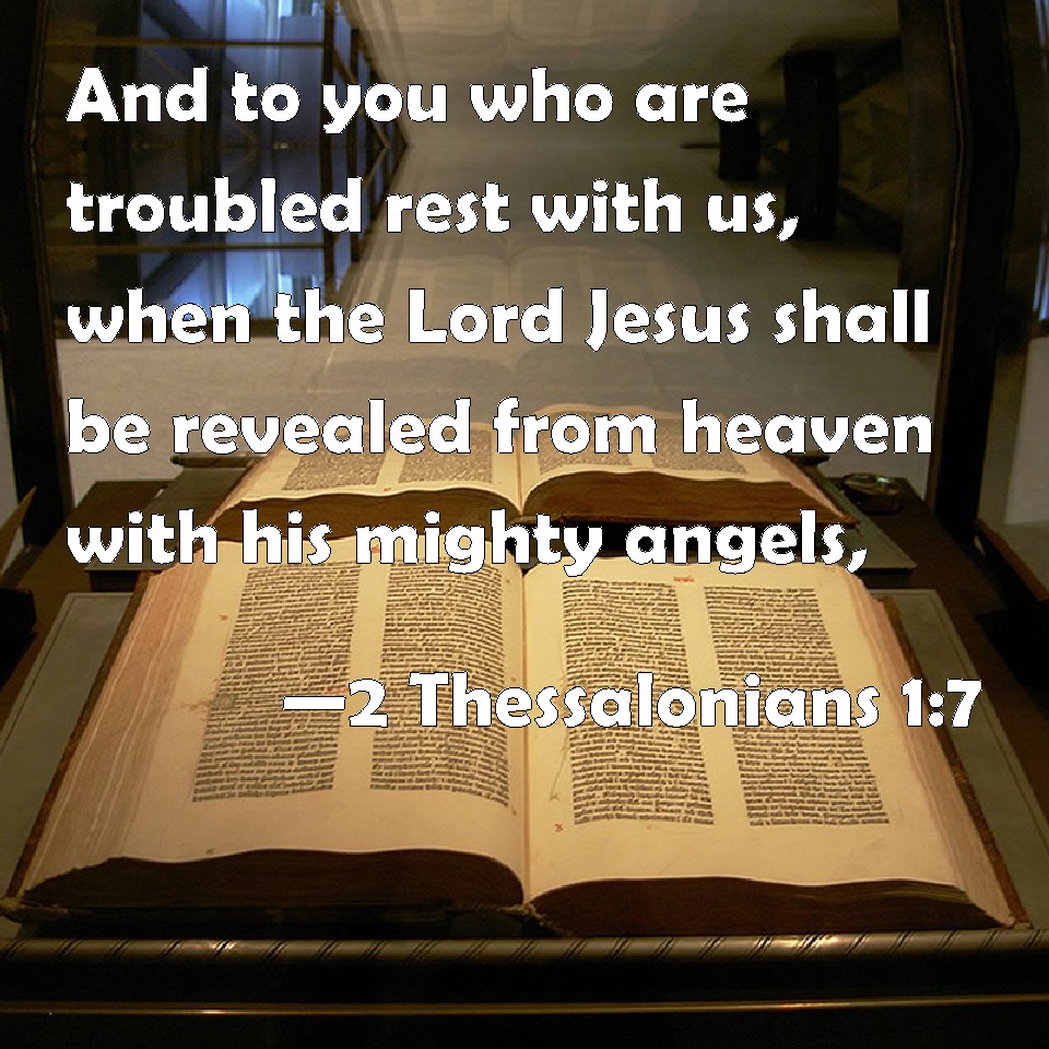 Choose a Background 2 Thessalonians 1:7 And to you who are troubled rest with us, when the Lord Jesus shall be revealed from heaven with his mighty angels, KJV: And to you who are troubled rest with us, when the Lord Jesus shall be revealed from heaven with his mighty angels, DRB: And to you who are troubled, rest with us when the Lord Jesus shall be revealed from heaven, with the angels of his power: DBT: and to you that are troubled repose with us, at the revelation of the Lord Jesus from heaven, with the angels of his power, ERV: and to you that are afflicted rest with us, at the revelation of the Lord Jesus from heaven with the angels of his power WBT: And to you who are troubled, rest with us, when the Lord Jesus shall be revealed from heaven with his mighty angels, WEB: and to give relief to you who are afflicted with us, when the Lord Jesus is revealed from heaven with his mighty angels in flaming fire, YLT: and to you who are troubled — rest with us in the revelation of the Lord Jesus from heaven, with messengers of his power,Links 2 Thessalonians 1:7 NIV • 2 Thessalonians 1:7 NLT • 2 Thessalonians 1:7 ESV • 2 Thessalonians 1:7 NASB • 2 Thessalonians 1:7 KJV • 2 Thessalonians 1:7 Interlinear • 2 Thessalonians 1:7 Commentaries • 2 Thessalonians 1:7 Parallel Texts • 2 Thessalonians 1:7 Bible Apps • 2 Thessalonians 1:7 Parallel • Bible Hub |