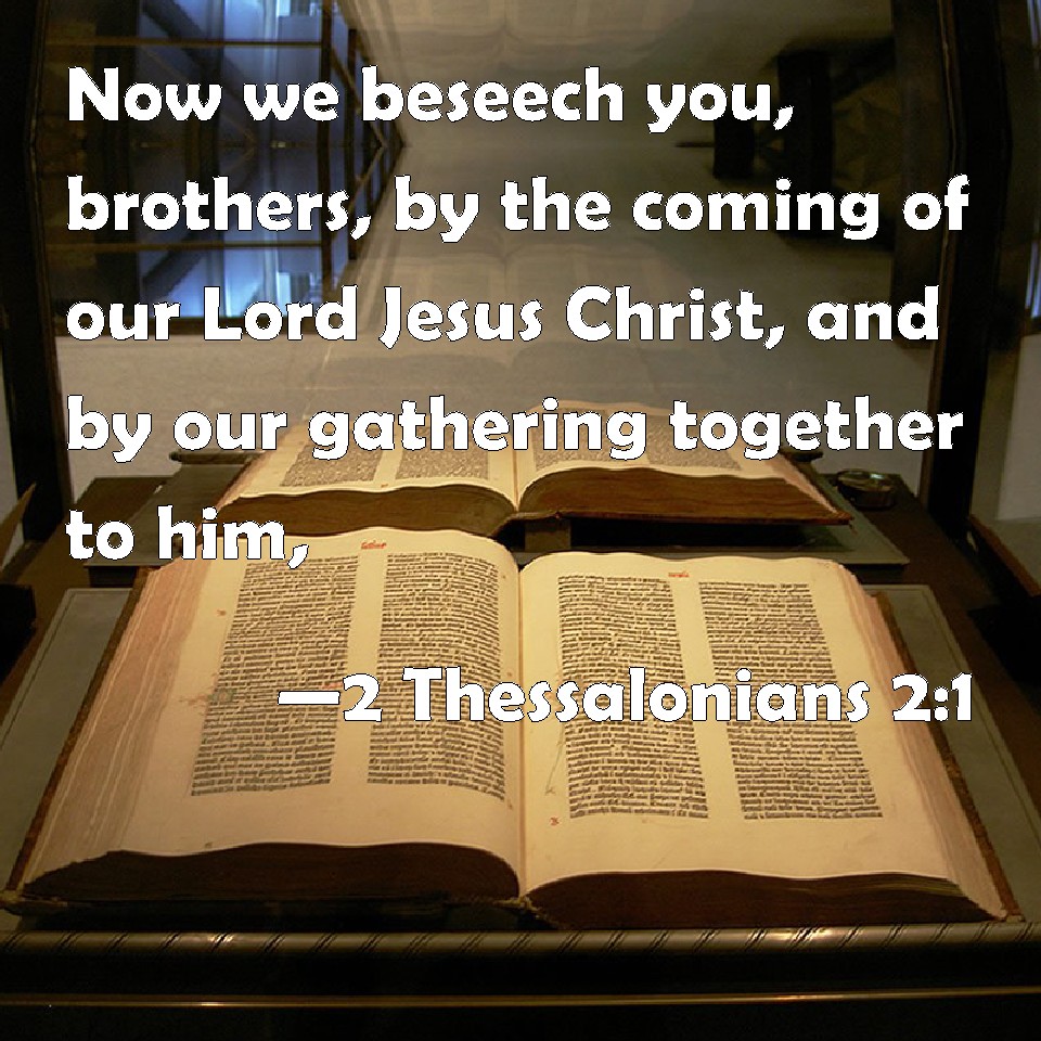 Choose a Background 2 Thessalonians 2:1 Now we beseech you, brothers, by the coming of our Lord Jesus Christ, and by our gathering together to him, KJV: Now we beseech you, brethren, by the coming of our Lord Jesus Christ, and by our gathering together unto him, DRB: And we beseech you, brethren, by the coming of our Lord Jesus Christ, and of our gathering together unto him: DBT: Now we beg you, brethren, by the coming of our Lord Jesus Christ and our gathering together to him, ERV: Now we beseech you, brethren, touching the coming of our Lord Jesus Christ, and our gathering together unto him; WBT: Now we beseech you, brethren, by the coming of our Lord Jesus Christ, and by our gathering to him. WEB: Now, brothers, concerning the coming of our Lord Jesus Christ, and our gathering together to him, we ask you YLT: And we ask you, brethren, in regard to the presence of our Lord Jesus Christ, and of our gathering together unto him,Links 2 Thessalonians 2:1 NIV • 2 Thessalonians 2:1 NLT • 2 Thessalonians 2:1 ESV • 2 Thessalonians 2:1 NASB • 2 Thessalonians 2:1 KJV • 2 Thessalonians 2:1 Interlinear • 2 Thessalonians 2:1 Commentaries • 2 Thessalonians 2:1 Parallel Texts • 2 Thessalonians 2:1 Bible Apps • 2 Thessalonians 2:1 Parallel • Bible Hub |