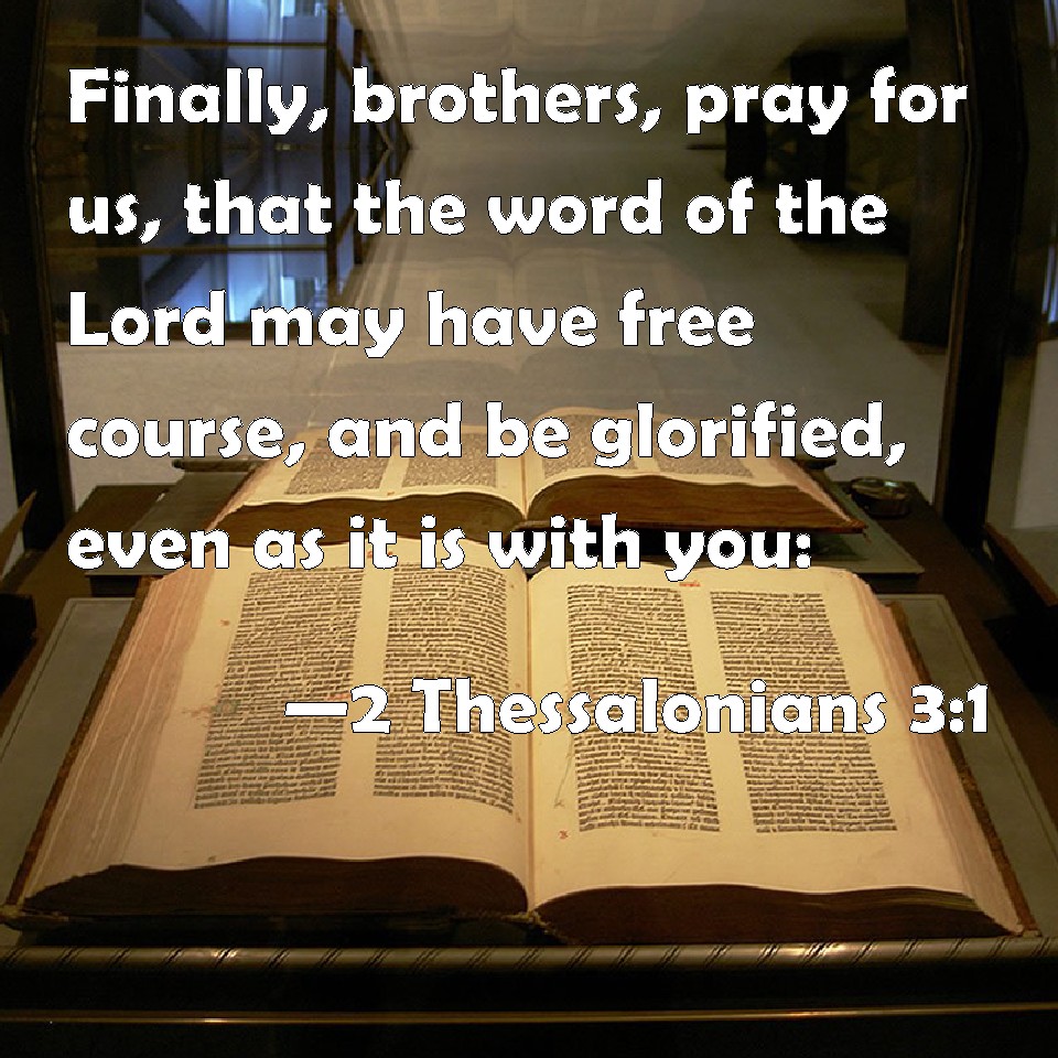 Choose a Background 2 Thessalonians 3:1 Finally, brothers, pray for us, that the word of the Lord may have free course, and be glorified, even as it is with you: KJV: Finally, brethren, pray for us, that the word of the Lord may have free course, and be glorified, even as it is with you: DRB: For the rest, brethren, pray for us, that the word of God may run, and may be glorified, even as among you; DBT: For the rest, brethren, pray for us, that the word of the Lord may run and be glorified, even as also with you; ERV: Finally, brethren, pray for us, that the word of the Lord may run and be glorified, even as also it is with you; WBT: Finally, brethren, pray for us, that the word of the Lord may have free course, and be glorified, even as it is with you; WEB: Finally, brothers, pray for us, that the word of the Lord may spread rapidly and be glorified, even as also with you; YLT: As to the rest, pray ye, brethren, concerning us, that the word of the Lord may run and may be glorified, as also with you,Links 2 Thessalonians 3:1 NIV • 2 Thessalonians 3:1 NLT • 2 Thessalonians 3:1 ESV • 2 Thessalonians 3:1 NASB • 2 Thessalonians 3:1 KJV • 2 Thessalonians 3:1 Interlinear • 2 Thessalonians 3:1 Commentaries • 2 Thessalonians 3:1 Parallel Texts • 2 Thessalonians 3:1 Bible Apps • 2 Thessalonians 3:1 Parallel • Bible Hub |