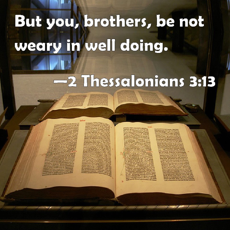 Choose a Background 2 Thessalonians 3:13 But you, brothers, be not weary in well doing. KJV: But ye, brethren, be not weary in well doing. DRB: But you, brethren, be not weary in well doing. DBT: But ye, brethren, do not faint in well-doing. ERV: But ye, brethren, be not weary in well-doing. WBT: But ye, brethren, be not weary in well-doing. WEB: But you, brothers, don't be weary in doing well. YLT: and ye, brethren, may ye not be weary doing well,Links 2 Thessalonians 3:13 NIV • 2 Thessalonians 3:13 NLT • 2 Thessalonians 3:13 ESV • 2 Thessalonians 3:13 NASB • 2 Thessalonians 3:13 KJV • 2 Thessalonians 3:13 Interlinear • 2 Thessalonians 3:13 Commentaries • 2 Thessalonians 3:13 Parallel Texts • 2 Thessalonians 3:13 Bible Apps • 2 Thessalonians 3:13 Parallel • Bible Hub |