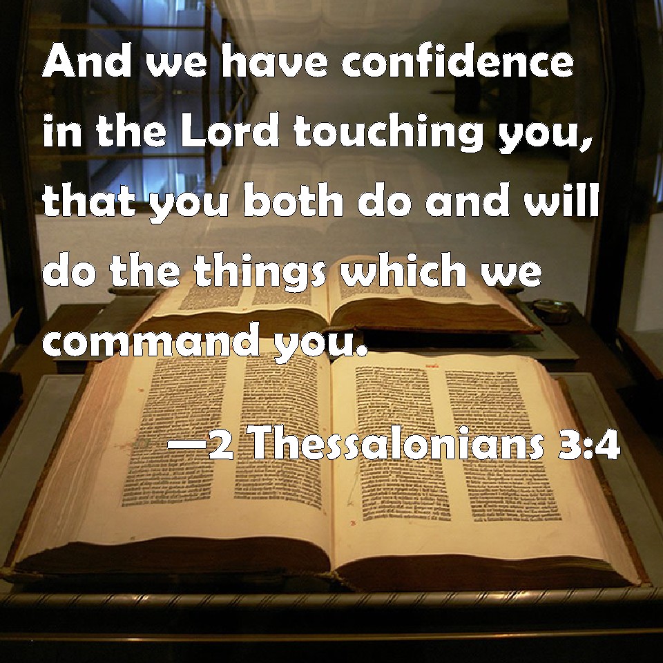 Choose a Background 2 Thessalonians 3:4 And we have confidence in the Lord touching you, that you both do and will do the things which we command you. KJV: And we have confidence in the Lord touching you, that ye both do and will do the things which we command you. DRB: And we have confidence concerning you in the Lord, that the things which we command, you both do, and will do. DBT: But we trust in the Lord as to you, that the things which we enjoin, ye both do and will do. ERV: And we have confidence in the Lord touching you, that ye both do and will do the things which we command. WBT: And we have confidence in the Lord concerning you, that ye both do and will do the things which we command you. WEB: We have confidence in the Lord concerning you, that you both do and will do the things we command. YLT: and we have confidence in the Lord touching you, that the things that we command you ye both do and will do;Links 2 Thessalonians 3:4 NIV • 2 Thessalonians 3:4 NLT • 2 Thessalonians 3:4 ESV • 2 Thessalonians 3:4 NASB • 2 Thessalonians 3:4 KJV • 2 Thessalonians 3:4 Interlinear • 2 Thessalonians 3:4 Commentaries • 2 Thessalonians 3:4 Parallel Texts • 2 Thessalonians 3:4 Bible Apps • 2 Thessalonians 3:4 Parallel • Bible Hub |