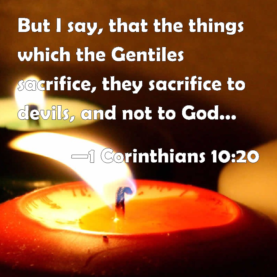 Choose a Background 1 Corinthians 10:20 But I say, that the things which the Gentiles sacrifice, they sacrifice to devils, and not to God: and I would not that you should have fellowship with devils. KJV: But I say, that the things which the Gentiles sacrifice, they sacrifice to devils, and not to God: and I would not that ye should have fellowship with devils. DRB: But the things which the heathens sacrifice, they sacrifice to devils, and not to God. And I would not that you should be made partakers with devils. DBT: But that what the nations sacrifice they sacrifice to demons, and not to God. Now I do not wish you to be in communion with demons. ERV: But I say, that the things which the Gentiles sacrifice, they sacrifice to devils, and not to God: and I would not that ye should have communion with devils. WBT: But I say, that the things which the Gentiles sacrifice, they sacrifice to demons, and not to God: and I would not that ye should have fellowship with demons. WEB: But I say that the things which the Gentiles sacrifice, they sacrifice to demons, and not to God, and I don't desire that you would have fellowship with demons. YLT: no, but that the things that the nations sacrifice — they sacrifice to demons and not to God; and I do not wish you to come into the fellowship of the demons.Links 1 Corinthians 10:20 NIV • 1 Corinthians 10:20 NLT • 1 Corinthians 10:20 ESV • 1 Corinthians 10:20 NASB • 1 Corinthians 10:20 KJV • 1 Corinthians 10:20 Interlinear • 1 Corinthians 10:20 Commentaries • 1 Corinthians 10:20 Parallel Texts • 1 Corinthians 10:20 Bible Apps • 1 Corinthians 10:20 Parallel • Bible Hub |