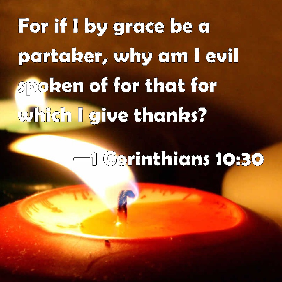 Choose a Background 1 Corinthians 10:30 For if I by grace be a partaker, why am I evil spoken of for that for which I give thanks? KJV: For if I by grace be a partaker, why am I evil spoken of for that for which I give thanks? DRB: If I partake with thanksgiving, why am I evil spoken of, for that for which I give thanks ? DBT: If I partake with thanksgiving, why am I spoken evil of for what I give thanks for? ERV: If I by grace partake, why am I evil spoken of for that for which I give thanks? WBT: For if I by grace am a partaker, why am I evil spoken of for that for which I give thanks? WEB: If I partake with thankfulness, why am I denounced for that for which I give thanks? YLT: and if I thankfully do partake, why am I evil spoken of, for that for which I give thanks?Links 1 Corinthians 10:30 NIV • 1 Corinthians 10:30 NLT • 1 Corinthians 10:30 ESV • 1 Corinthians 10:30 NASB • 1 Corinthians 10:30 KJV • 1 Corinthians 10:30 Interlinear • 1 Corinthians 10:30 Commentaries • 1 Corinthians 10:30 Parallel Texts • 1 Corinthians 10:30 Bible Apps • 1 Corinthians 10:30 Parallel • Bible Hub |