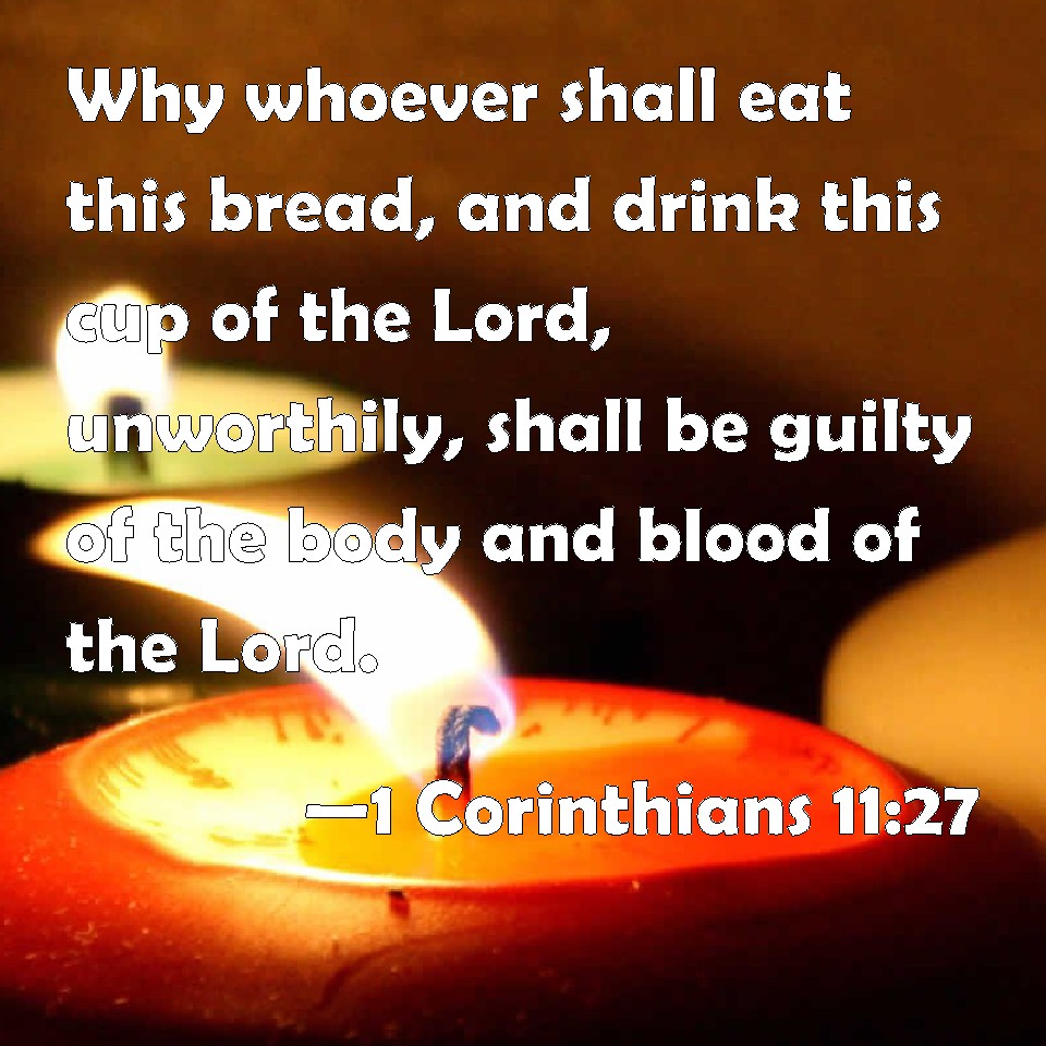Choose a Background 1 Corinthians 11:27 Why whoever shall eat this bread, and drink this cup of the Lord, unworthily, shall be guilty of the body and blood of the Lord. KJV: Wherefore whosoever shall eat this bread, and drink this cup of the Lord, unworthily, shall be guilty of the body and blood of the Lord. DRB: Therefore whosoever shall eat this bread, or drink the chalice of the Lord unworthily, shall be guilty of the body and of the blood of the Lord. DBT: So that whosoever shall eat the bread, or drink the cup of the Lord, unworthily, shall be guilty in respect of the body and of the blood of the Lord. ERV: Wherefore whosoever shall eat the bread or drink the cup of the Lord unworthily, shall be guilty of the body and the blood of the Lord. WBT: Wherefore, whoever shall eat this bread, and drink this cup of the Lord unworthily, shall be guilty of the body and blood of the Lord. WEB: Therefore whoever eats this bread or drinks the Lord's cup in a way unworthy of the Lord will be guilty of the body and the blood of the Lord. YLT: so that whoever may eat this bread or may drink the cup of the Lord unworthily, guilty he shall be of the body and blood of the Lord:Links 1 Corinthians 11:27 NIV • 1 Corinthians 11:27 NLT • 1 Corinthians 11:27 ESV • 1 Corinthians 11:27 NASB • 1 Corinthians 11:27 KJV • 1 Corinthians 11:27 Interlinear • 1 Corinthians 11:27 Commentaries • 1 Corinthians 11:27 Parallel Texts • 1 Corinthians 11:27 Bible Apps • 1 Corinthians 11:27 Parallel • Bible Hub |