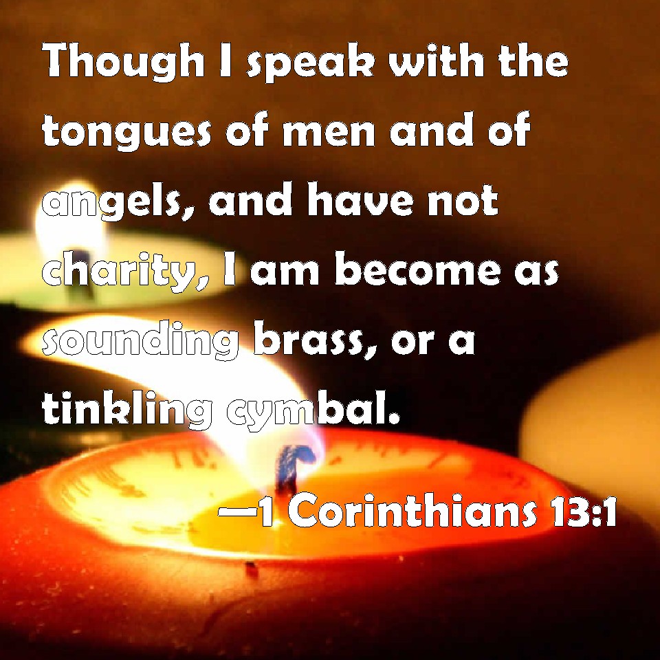 Choose a Background 1 Corinthians 13:1 Though I speak with the tongues of men and of angels, and have not charity, I am become as sounding brass, or a tinkling cymbal. KJV: Though I speak with the tongues of men and of angels, and have not charity, I am become as sounding brass, or a tinkling cymbal. DRB: IF I speak with the tongues of men, and of angels, and have not charity, I am become as sounding brass, or a tinkling cymbal. DBT: If I speak with the tongues of men and of angels, but have not love, I am become sounding brass or a clanging cymbal. ERV: If I speak with the tongues of men and of angels, but have not love, I am become sounding brass, or a clanging cymbal. WBT: Though I speak with the tongues of men and of angels, and have not charity, I am become as sounding brass, or a tinkling cymbal. WEB: If I speak with the languages of men and of angels, but don't have love, I have become sounding brass, or a clanging cymbal. YLT: If with the tongues of men and of messengers I speak, and have not love, I have become brass sounding, or a cymbal tinkling;Links 1 Corinthians 13:1 NIV • 1 Corinthians 13:1 NLT • 1 Corinthians 13:1 ESV • 1 Corinthians 13:1 NASB • 1 Corinthians 13:1 KJV • 1 Corinthians 13:1 Interlinear • 1 Corinthians 13:1 Commentaries • 1 Corinthians 13:1 Parallel Texts • 1 Corinthians 13:1 Bible Apps • 1 Corinthians 13:1 Parallel • Bible Hub |