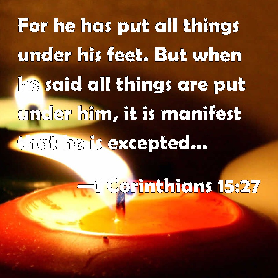 Choose a Background 1 Corinthians 15:27 For he has put all things under his feet. But when he said all things are put under him, it is manifest that he is excepted, which did put all things under him. KJV: For he hath put all things under his feet. But when he saith, all things are put under him, it is manifest that he is excepted, which did put all things under him. DRB: All things are put under him; undoubtedly, he is excepted, who put all things under him. DBT: For he has put all things in subjection under his feet. But when he says that all things are put in subjection, it is evident that it is except him who put all things in subjection to him. ERV: For, He put all things in subjection under his feet. But when he saith, All things are put in subjection, it is evident that he is excepted who did subject all things unto him. WBT: For he hath put all things under his feet. But when he saith, all things are put under him, it is manifest that he is excepted who did put all things under him. WEB: For, "He put all things in subjection under his feet." But when he says, "All things are put in subjection," it is evident that he is excepted who subjected all things to him. YLT: for all things He did put under his feet, and, when one may say that all things have been subjected, it is evident that He is excepted who did subject the all things to him,Links 1 Corinthians 15:27 NIV • 1 Corinthians 15:27 NLT • 1 Corinthians 15:27 ESV • 1 Corinthians 15:27 NASB • 1 Corinthians 15:27 KJV • 1 Corinthians 15:27 Interlinear • 1 Corinthians 15:27 Commentaries • 1 Corinthians 15:27 Parallel Texts • 1 Corinthians 15:27 Bible Apps • 1 Corinthians 15:27 Parallel • Bible Hub |