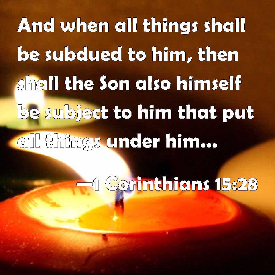Choose a Background 1 Corinthians 15:28 And when all things shall be subdued to him, then shall the Son also himself be subject to him that put all things under him, that God may be all in all. KJV: And when all things shall be subdued unto him, then shall the Son also himself be subject unto him that put all things under him, that God may be all in all. DRB: And when all things shall be subdued unto him, then the Son also himself shall be subject unto him that put all things under him, that God may be all in all. DBT: But when all things shall have been brought into subjection to him, then the Son also himself shall be placed in subjection to him who put all things in subjection to him, that God may be all in all.) ERV: And when all things have been subjected unto him, then shall the Son also himself be subjected to him that did subject all things unto him, that God may be all in all. WBT: And when all things shall be subdued to him, then shall the Son also himself be subject to him that put all things under him, that God may be all in all. WEB: When all things have been subjected to him, then the Son will also himself be subjected to him who subjected all things to him, that God may be all in all. YLT: and when the all things may be subjected to him, then the Son also himself shall be subject to Him, who did subject to him the all things, that God may be the all in all.Links 1 Corinthians 15:28 NIV • 1 Corinthians 15:28 NLT • 1 Corinthians 15:28 ESV • 1 Corinthians 15:28 NASB • 1 Corinthians 15:28 KJV • 1 Corinthians 15:28 Interlinear • 1 Corinthians 15:28 Commentaries • 1 Corinthians 15:28 Parallel Texts • 1 Corinthians 15:28 Bible Apps • 1 Corinthians 15:28 Parallel • Bible Hub |