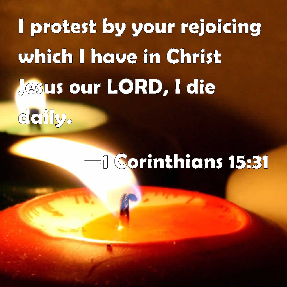 Choose a Background 1 Corinthians 15:31 I protest by your rejoicing which I have in Christ Jesus our LORD, I die daily. KJV: I protest by your rejoicing which I have in Christ Jesus our Lord, I die daily. DRB: I die daily, I protest by your glory, brethren, which I have in Christ Jesus our Lord. DBT: Daily I die, by your boasting which I have in Christ Jesus our Lord. ERV: I protest by that glorying in you, brethren, which I have in Christ Jesus our Lord, I die daily. WBT: I protest by your rejoicing which I have in Christ Jesus our Lord, I die daily. WEB: I affirm, by the boasting in you which I have in Christ Jesus our Lord, I die daily. YLT: Every day do I die, by the glorying of you that I have in Christ Jesus our Lord:Links 1 Corinthians 15:31 NIV • 1 Corinthians 15:31 NLT • 1 Corinthians 15:31 ESV • 1 Corinthians 15:31 NASB • 1 Corinthians 15:31 KJV • 1 Corinthians 15:31 Interlinear • 1 Corinthians 15:31 Commentaries • 1 Corinthians 15:31 Parallel Texts • 1 Corinthians 15:31 Bible Apps • 1 Corinthians 15:31 Parallel • Bible Hub |